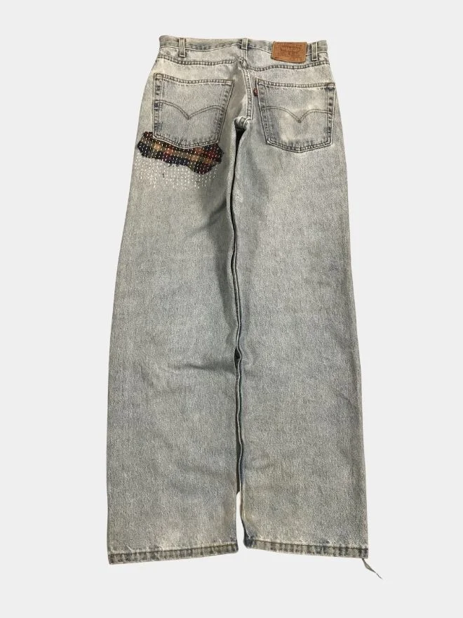 These unique reworked denim pants are crafted from vintage denim and designed with detailed white threadwork that gives the garment a distinctive handcrafted appearance. The pants feature sashiko-inspired stitching, a traditional Japanese embroidery technique known for its visible white thread patterns and textured detailing.