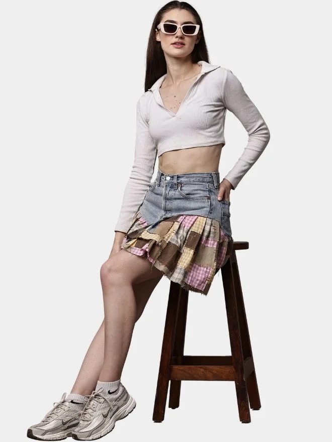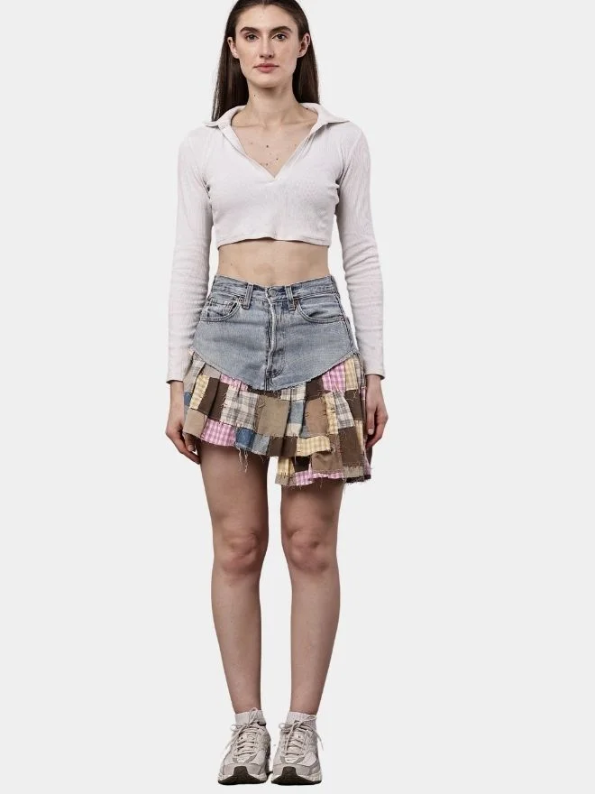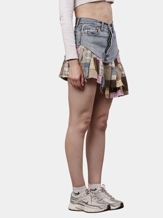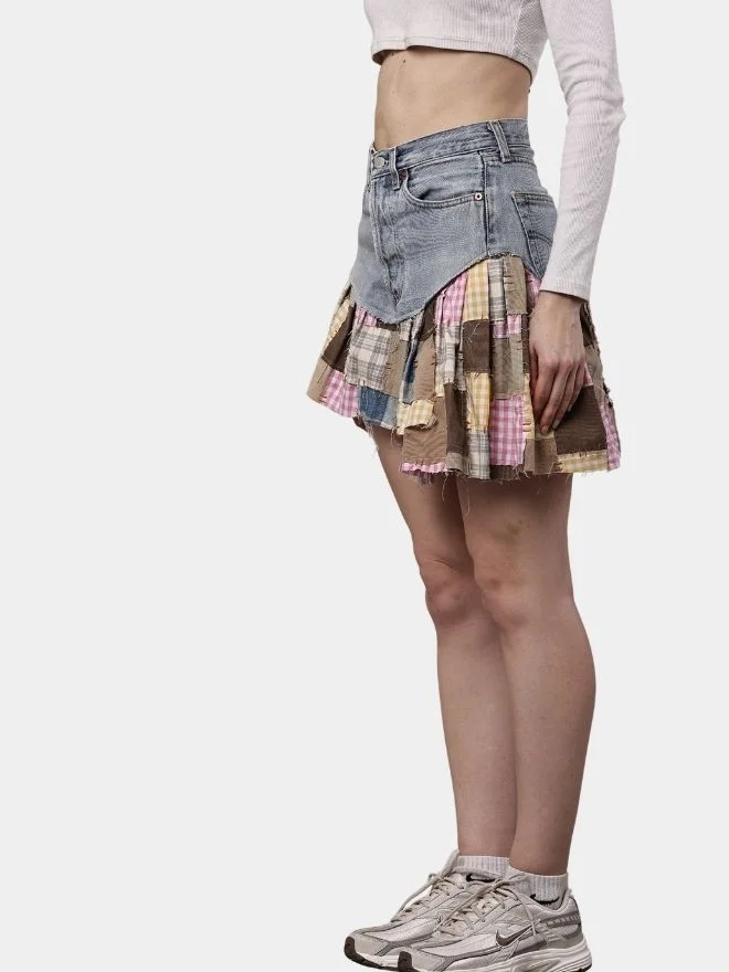 A creative reworked skirt crafted from vintage denim pants, featuring patchwork panels made from gingham shirt scraps and canvas fabric with subtle embroidered detailing.