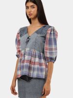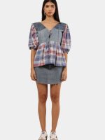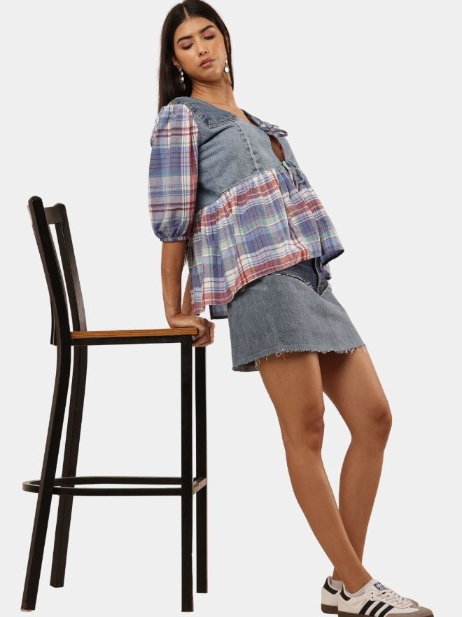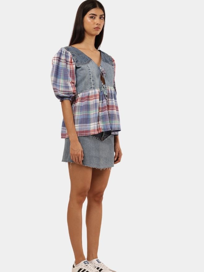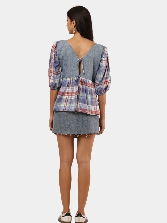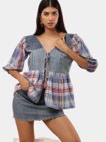 The top features a soft V-neckline with an adjustable tie-front closure, allowing for a customizable fit and effortless styling. Denim panels add structure and durability, while the plaid fabric introduces movement and visual contrast, creating a balanced blend of rugged and romantic aesthetics.
