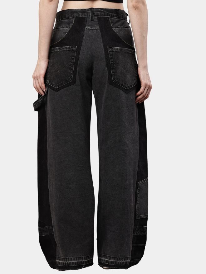 A statement pair of reworked baggy pants crafted from recycled trousers, featuring a dual-tone black design, carpenter-style detailing, raw hem finish, and unique pocket construction.