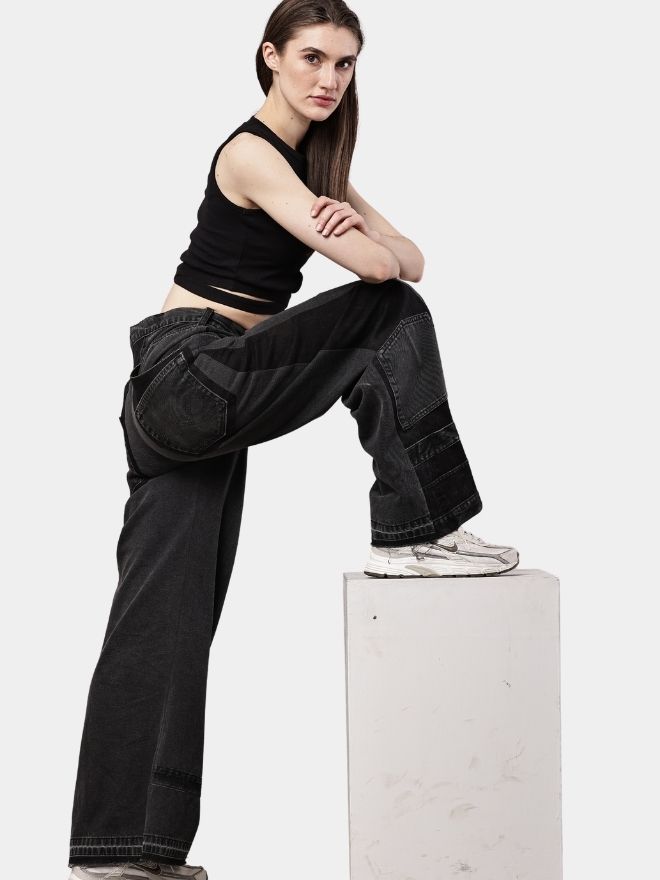 The pants feature a dual-tone black design, combining deep black and faded light black panels that create a striking contrast and unique visual texture. The relaxed baggy silhouette ensures comfort and a laid-back streetwear vibe.