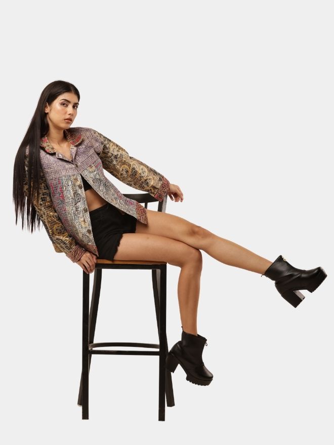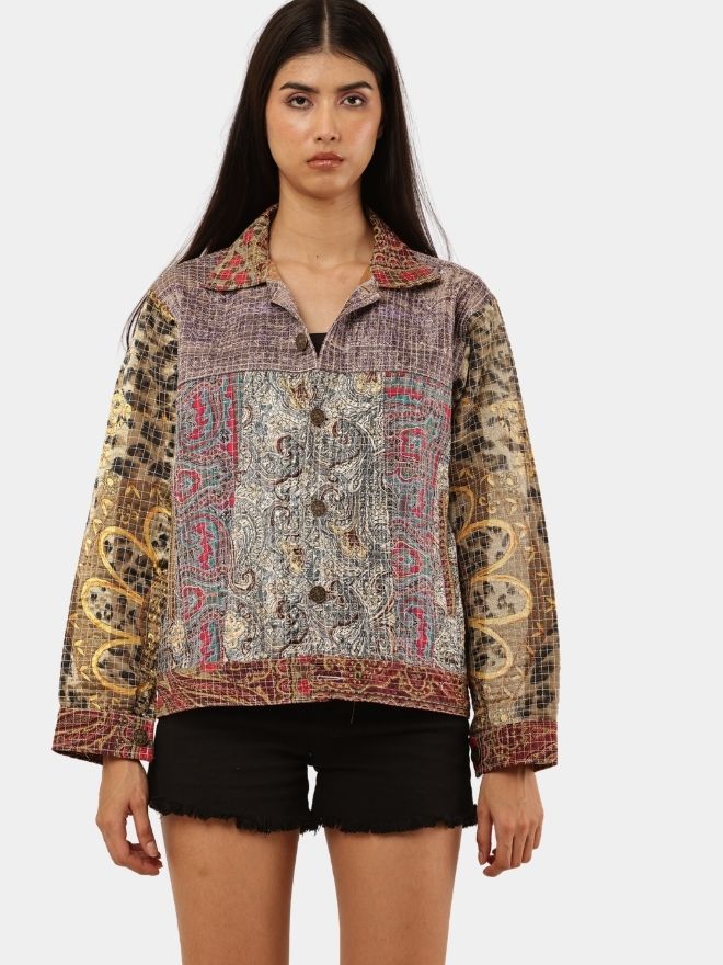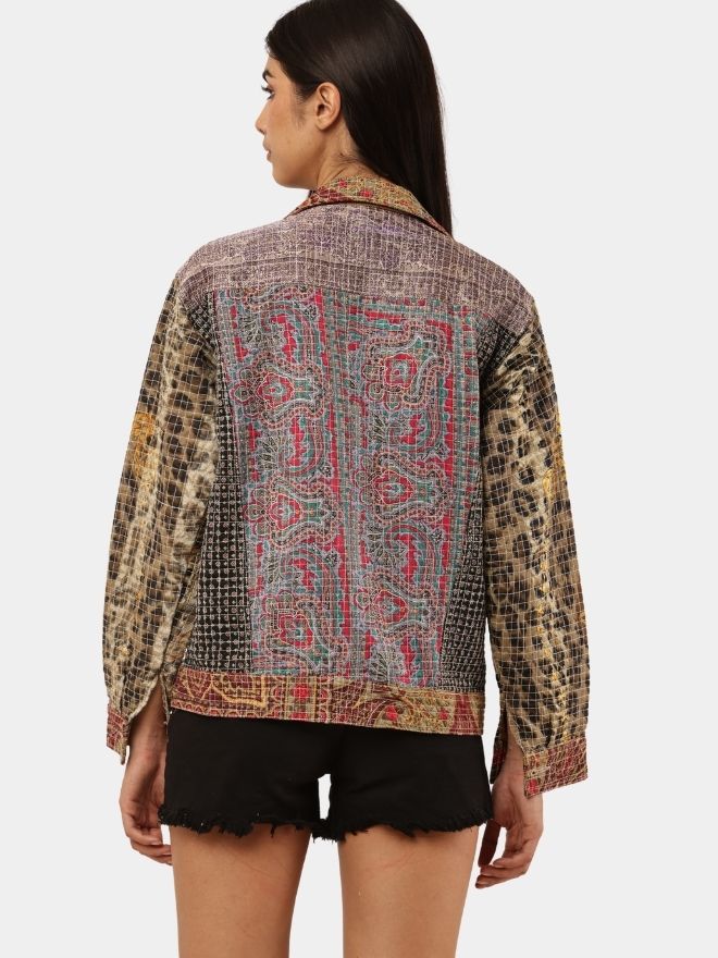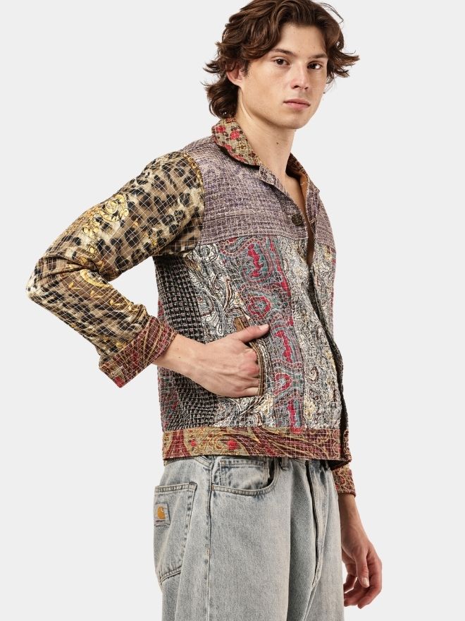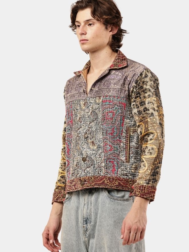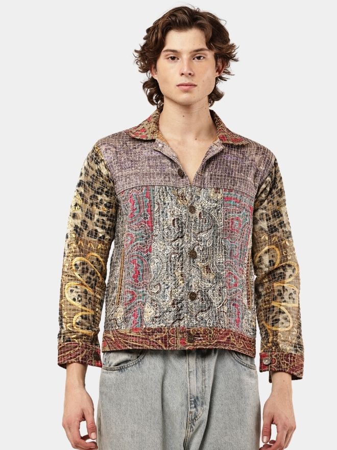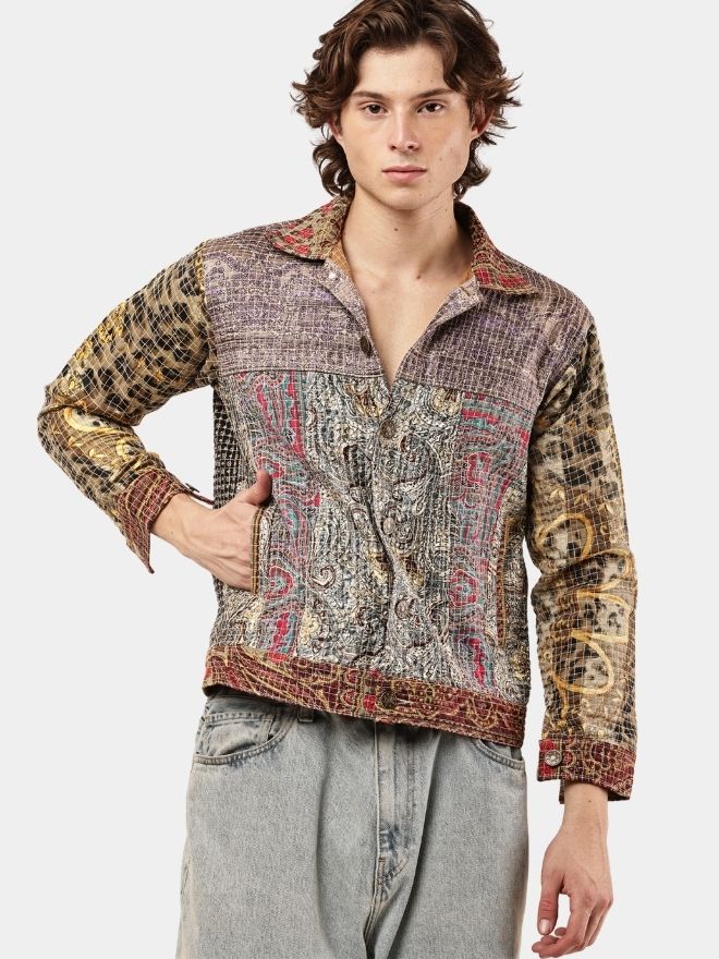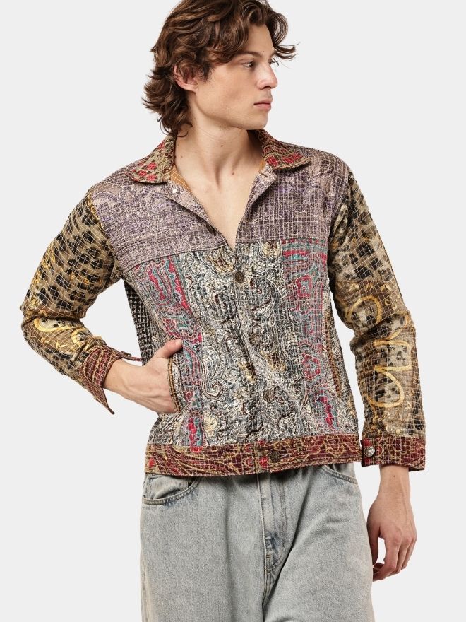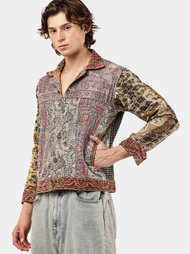 This reworked shirt is crafted using multiple embroidered and patterned textile panels, carefully combined to create a visually layered patchwork composition. The garment blends different woven motifs, intricate threadwork, and tapestry-style fabrics, resulting in a rich artisan aesthetic.