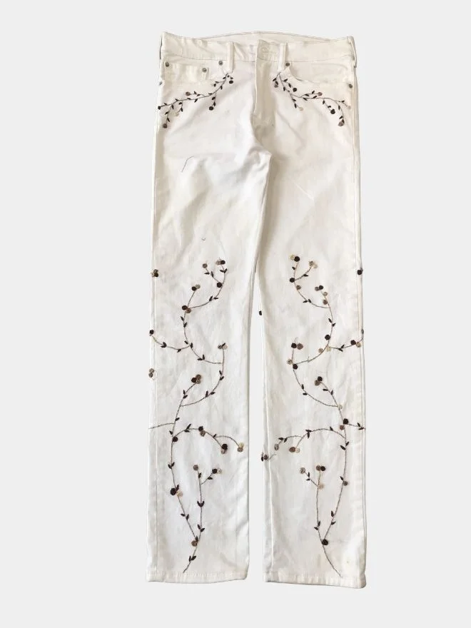 These reworked white denim pants bring together simplicity and intricate craftsmanship. Built from vintage garments and redesigned with carefully placed floral embroidery, the piece transforms classic white denim into something far more expressive.