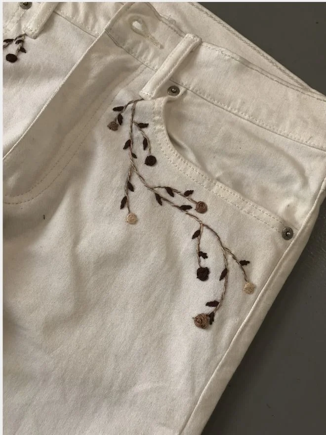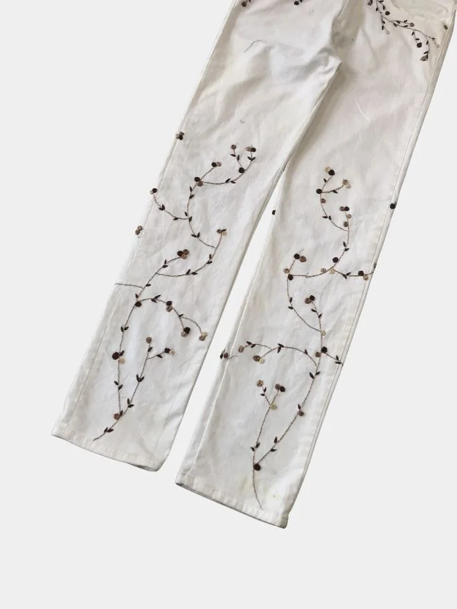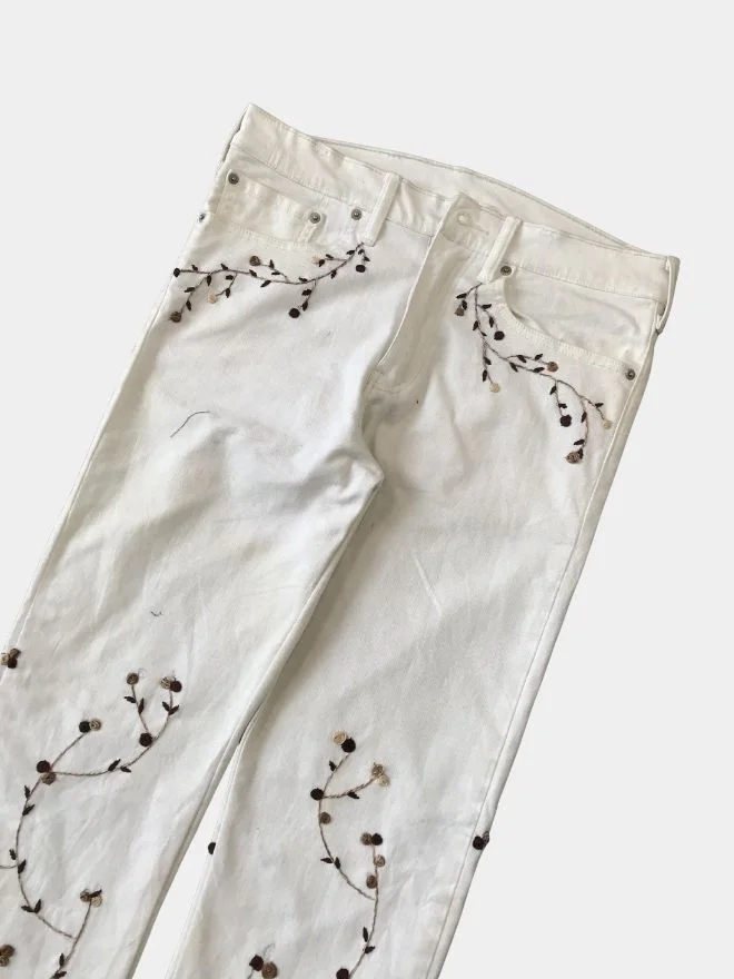 The clean white base creates a crisp, structured foundation, while the embroidered floral patterns travel across the legs, adding texture, warmth, and movement. The contrast between minimal denim and detailed stitching gives the pants a balanced aesthetic—subtle from a distance, yet rich with character up close.