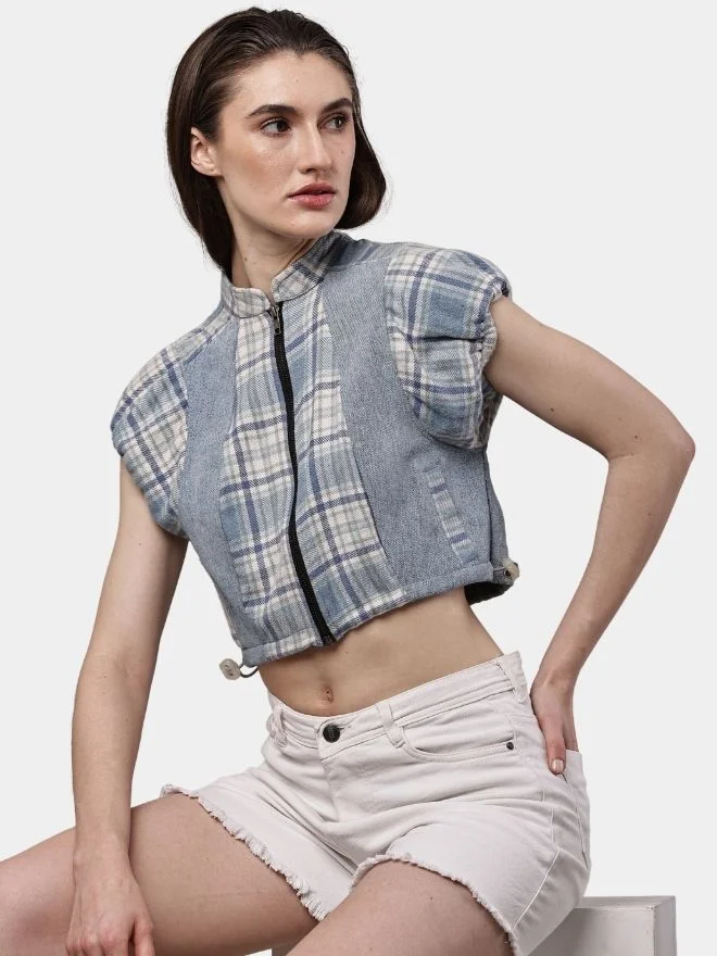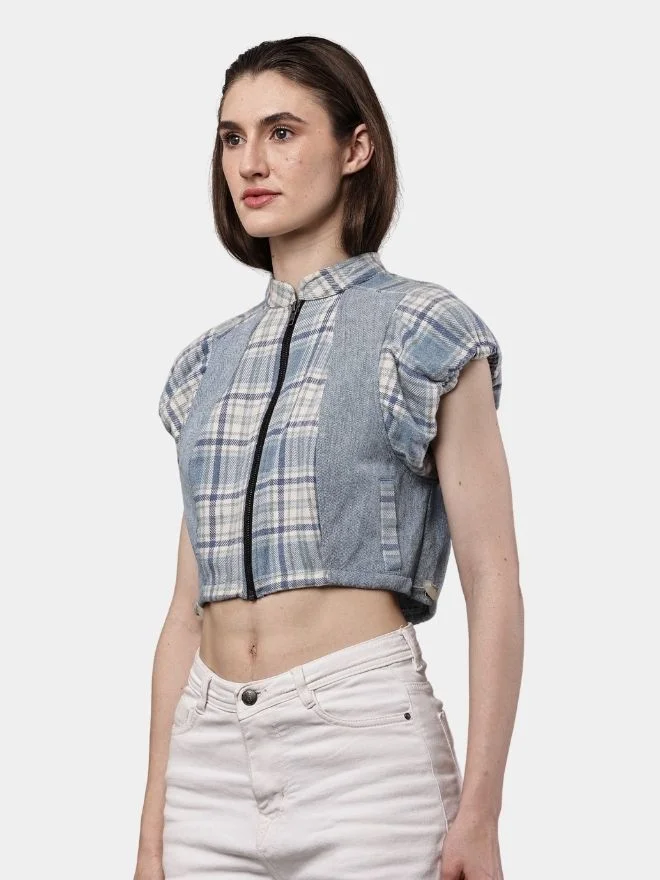 A stylish cropped top crafted from a reworked flannel check shirt, featuring a front zip closure, stand collar, and soft half puff sleeves for a modern vintage-inspired look.