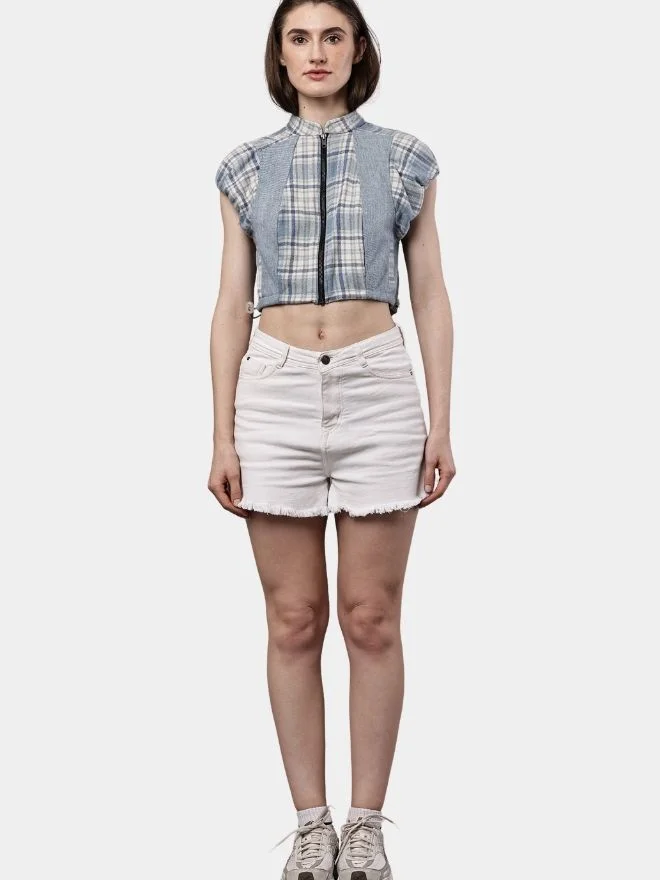 This unique crop top is crafted from a reworked flannel checker shirt, transforming classic flannel fabric into a contemporary fashion piece. The design blends soft grey denim panels with flannel check fabric, creating a balanced mix of texture and pattern.