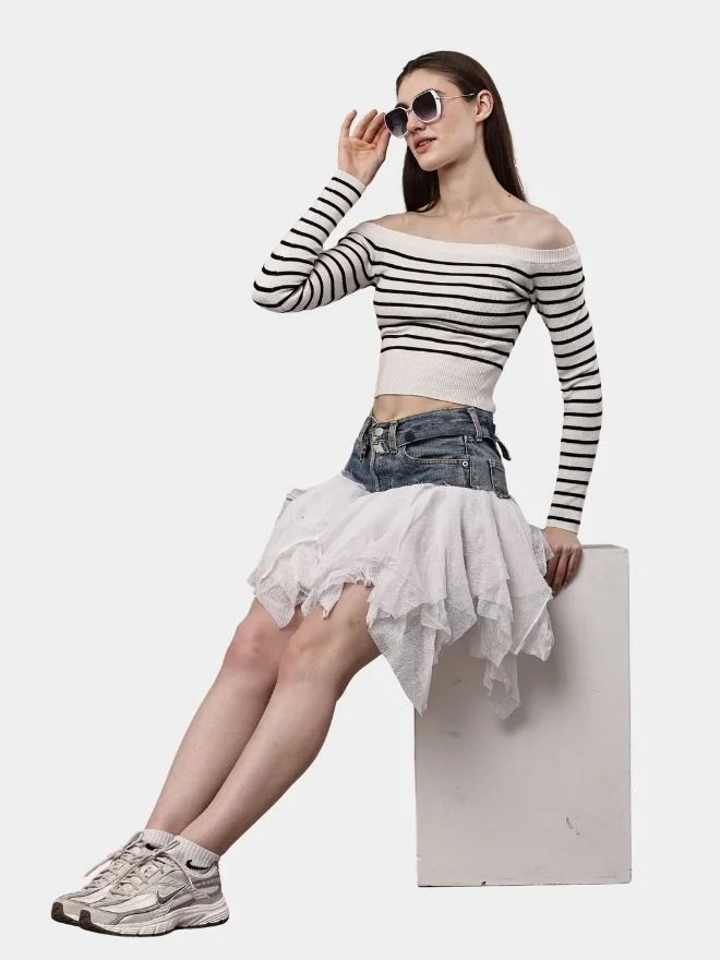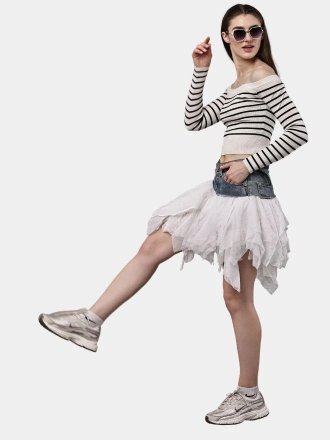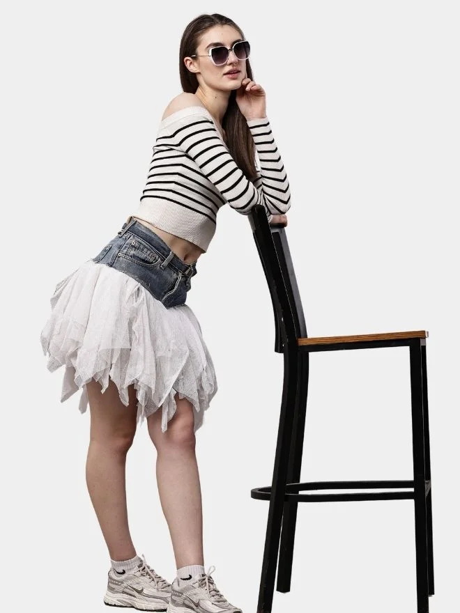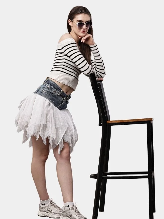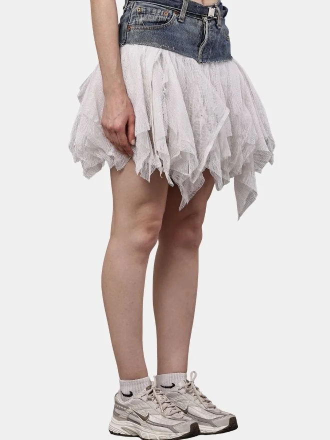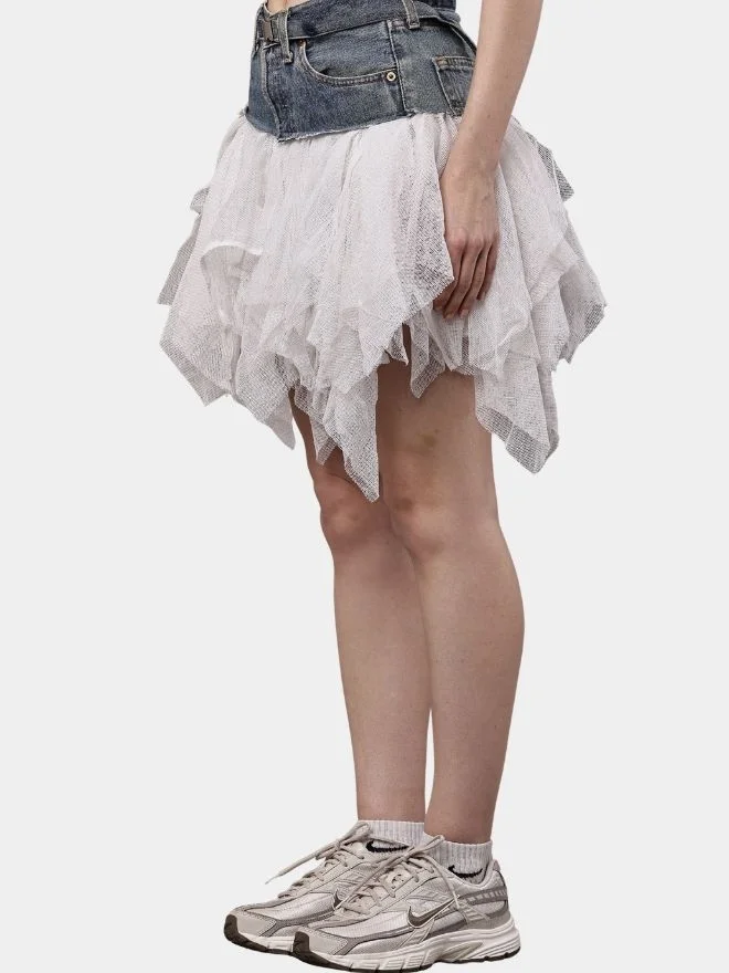 The standout feature is the soft mesh layered fabric, which adds movement, volume, and a light airy feel to the garment. The contrast between structured denim and flowing mesh creates a modern fashion-forward aesthetic that mixes streetwear with contemporary feminine styling.