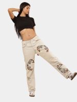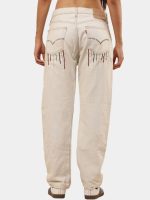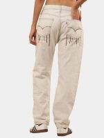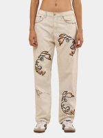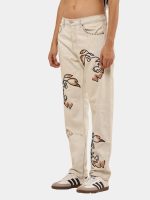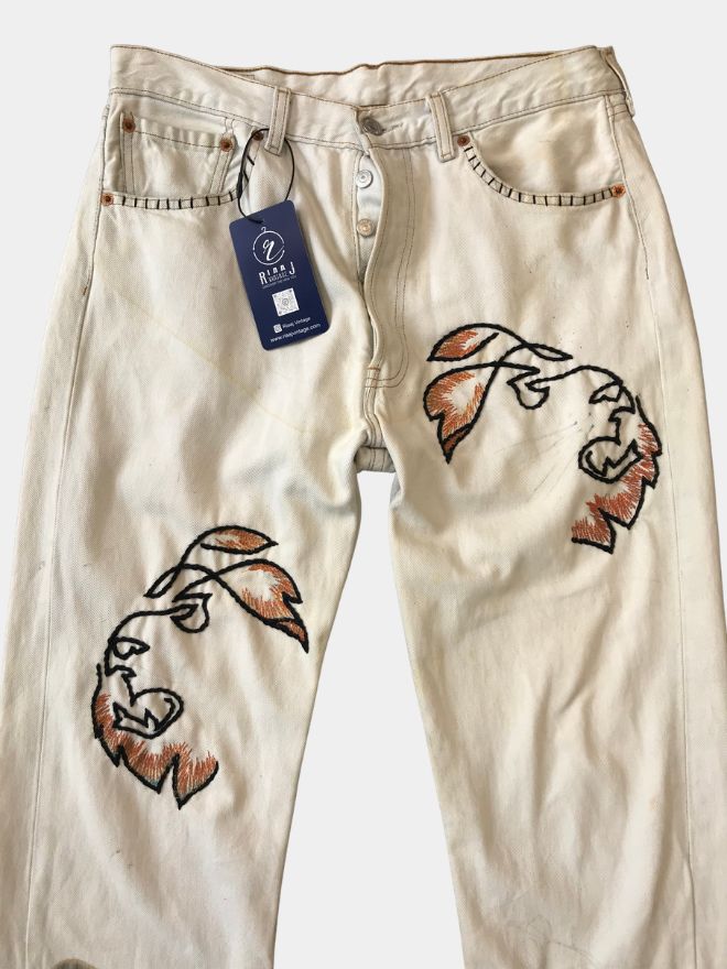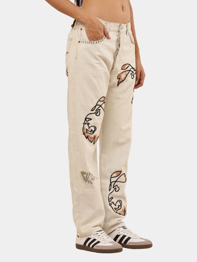 A fresh take on a denim classic — this off-white Levi’s 501 pant is reworked with vintage character and adorned with bold lion-face and anchor multicolor embroidery for striking style with heritage roots.