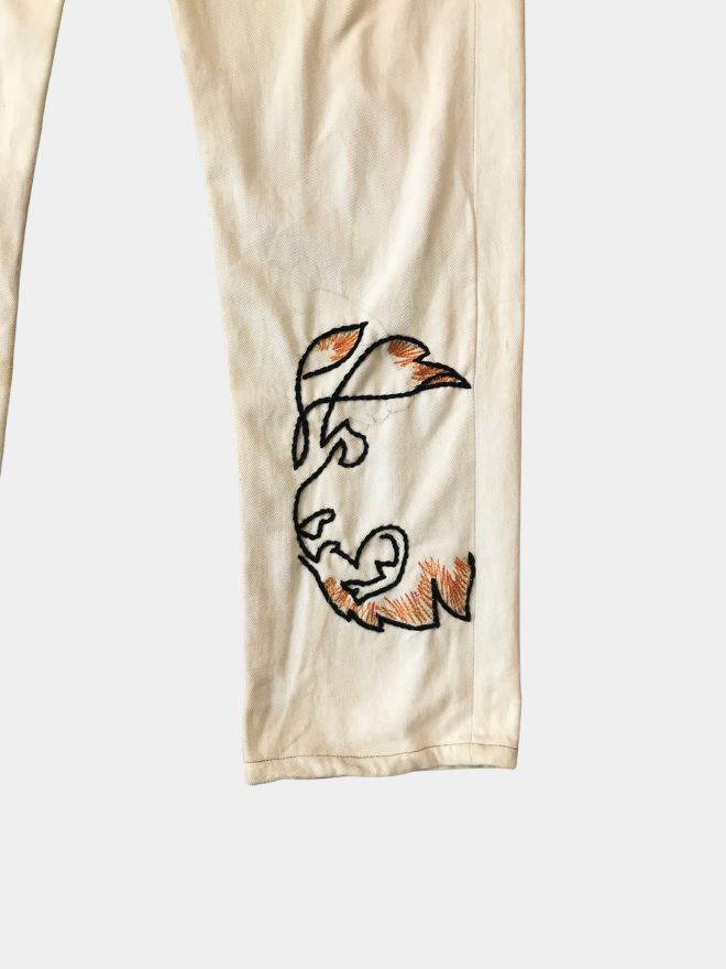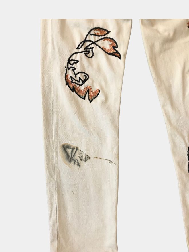This pant showcases hand-embroidered detailing featuring a striking lion face motif and anchor thread accents in rich multi-color stitching, elevating the garment into wearable art. The embroidery is painstakingly applied by skilled artisans to create depth, personality, and visual impact that stands apart from ordinary denim.