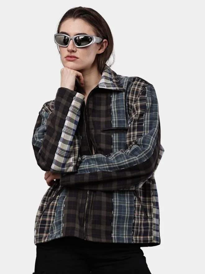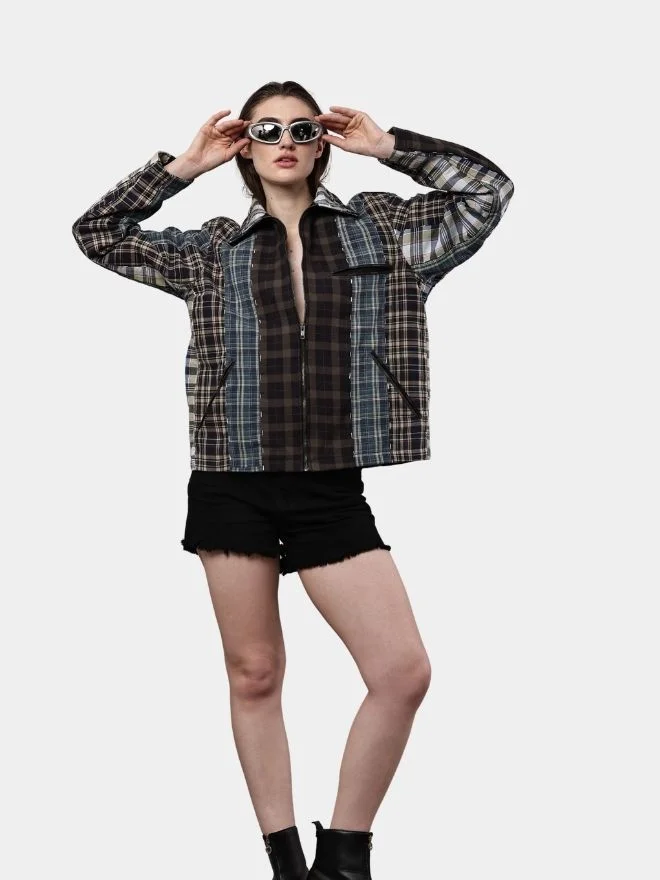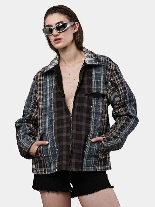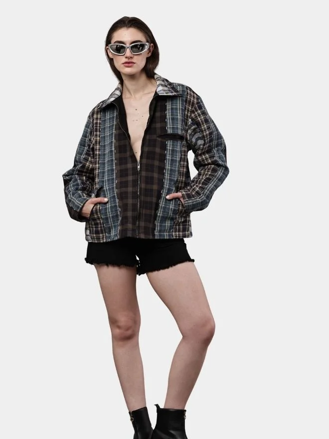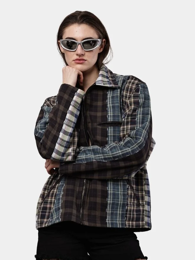 A structured collar and relaxed fit give the jacket a comfortable streetwear-inspired silhouette that works well for layering. The mix of check patterns and tones creates a bold visual contrast, making the piece stand out while still maintaining a classic vintage aesthetic.