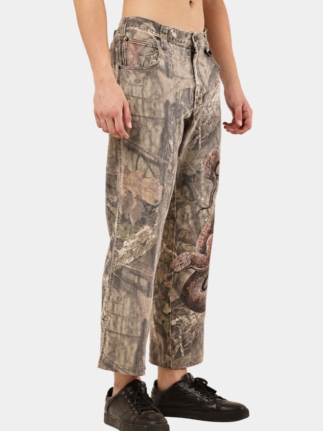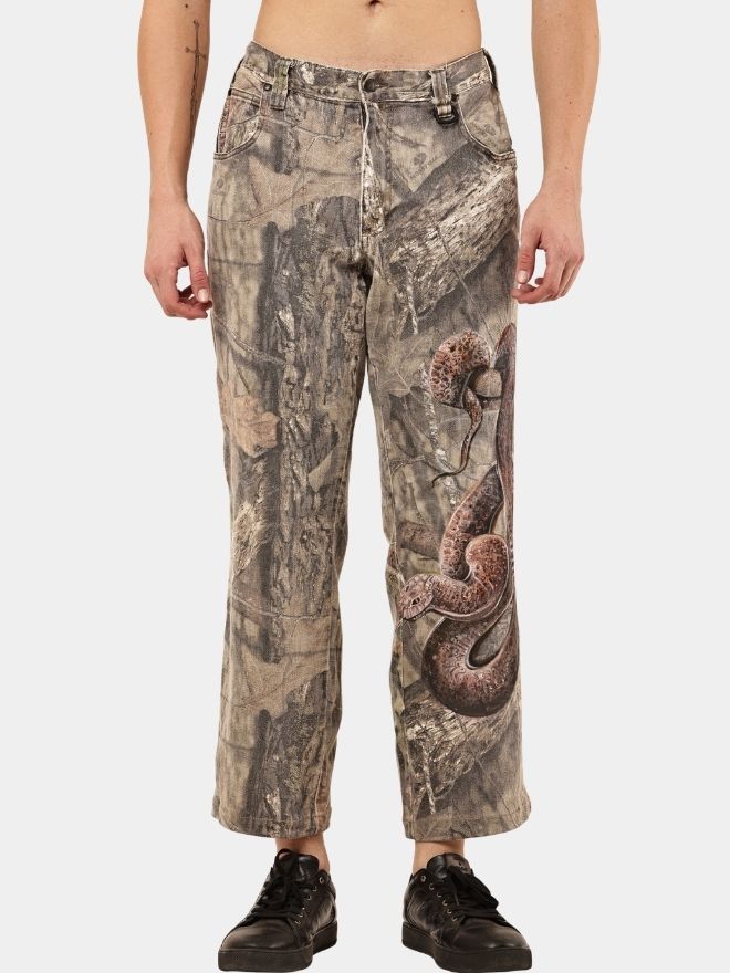 These custom reworked pants are crafted from original Realtree camouflage trousers and transformed into a wearable art piece. The base retains its authentic woodland camo aesthetic, while the surface is elevated with a detailed hand-painted snake graphic flowing across the leg panels.