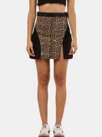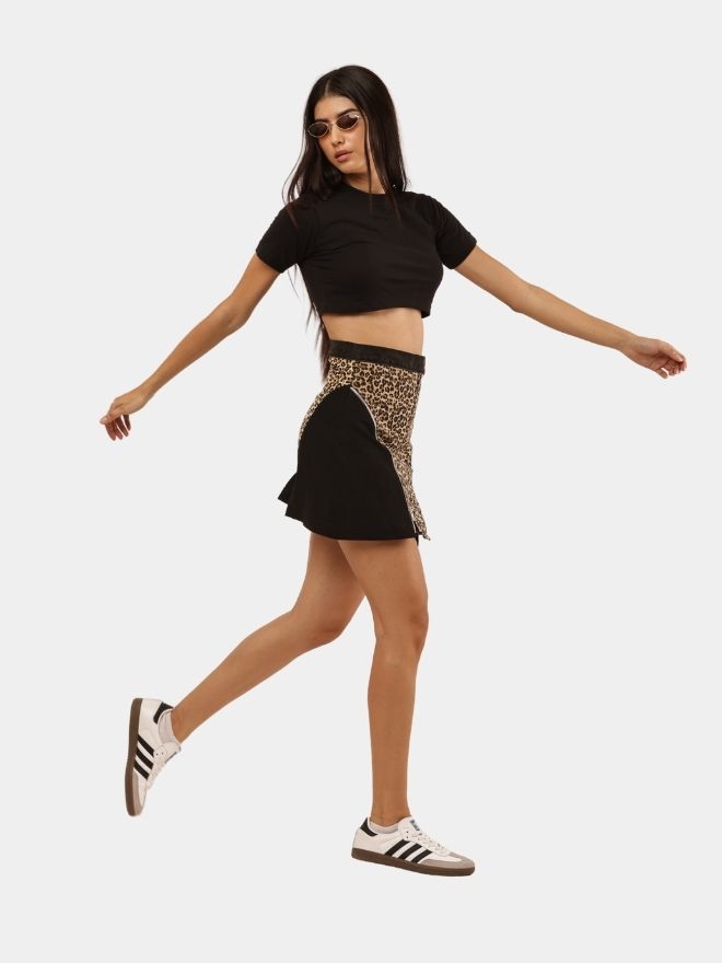 The design blends rugged denim panels with soft beige canvas fabric, creating a striking contrast of structure and flow. The canvas surface features a leopard-inspired screen print, adding a bold, wild aesthetic that brings energy and personality to the garment.
