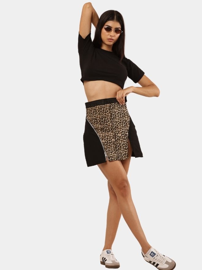 A bold fusion of heritage and street style — this reworked skirt is crafted from vintage Lee, Levi’s, and Wrangler denim, combined with beige canvas featuring leopard-inspired screen print and statement zipper detailing.