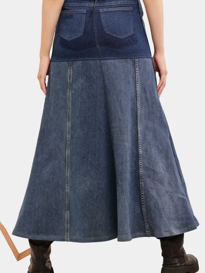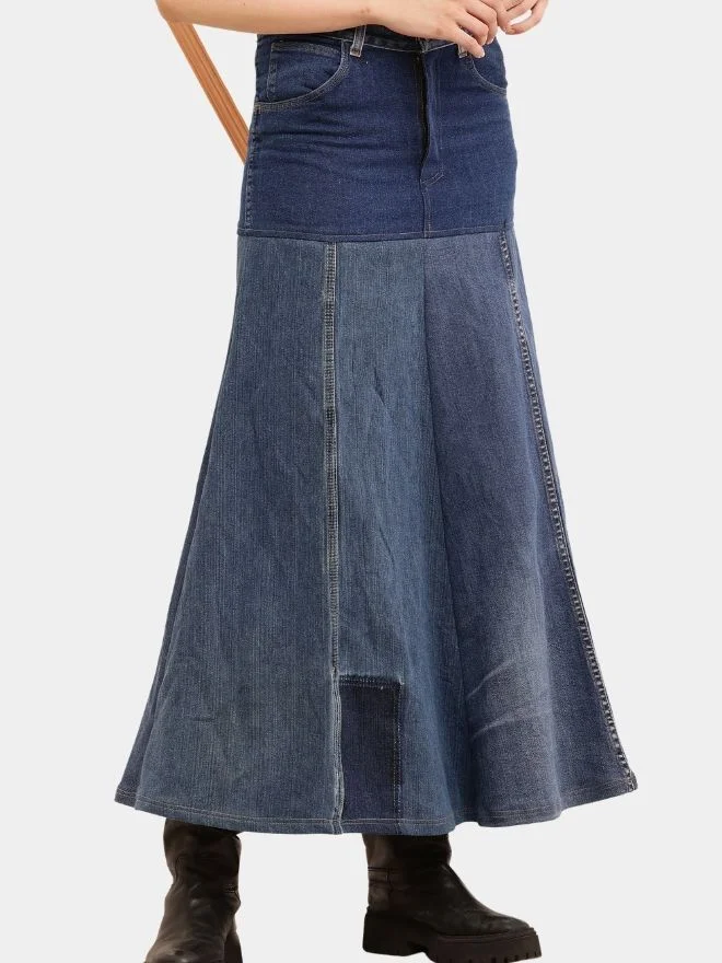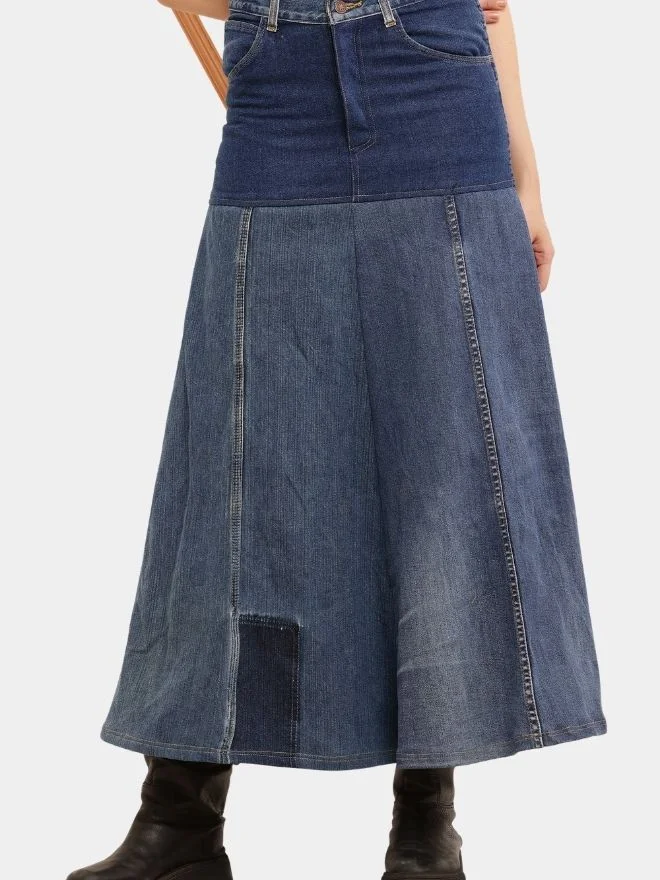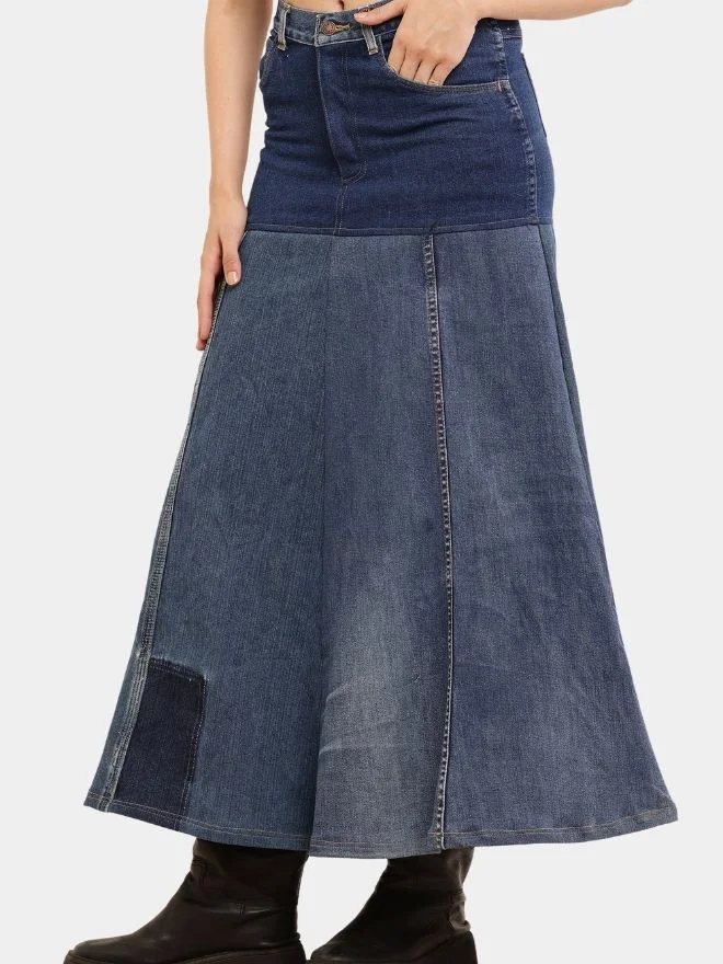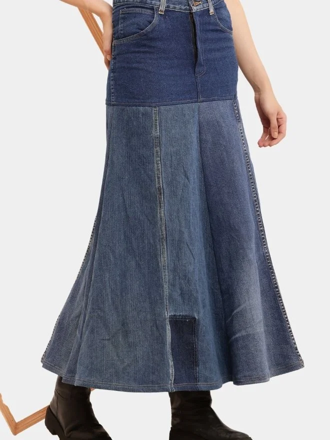 The vertical panel construction enhances the length and shape of the skirt, while subtle seam detailing adds depth and a handcrafted feel. The mix of denim washes gives the piece a naturally worn-in, authentic aesthetic.