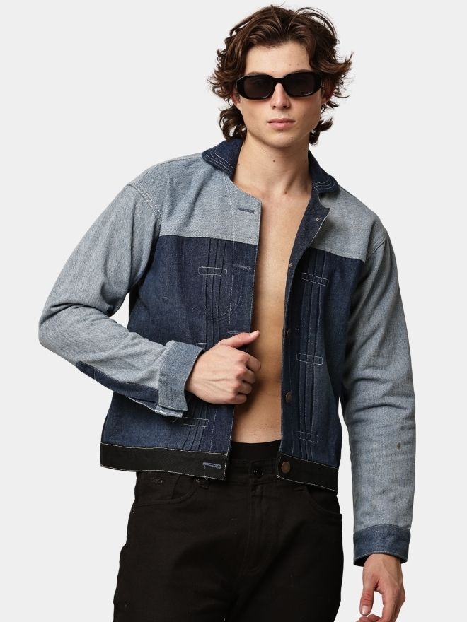 The front body features a darker indigo base framed by lighter denim sleeves and upper yoke sections. The back continues the contrast theme with horizontal panel blocking, giving the jacket a clean architectural appearance while maintaining authentic denim character.