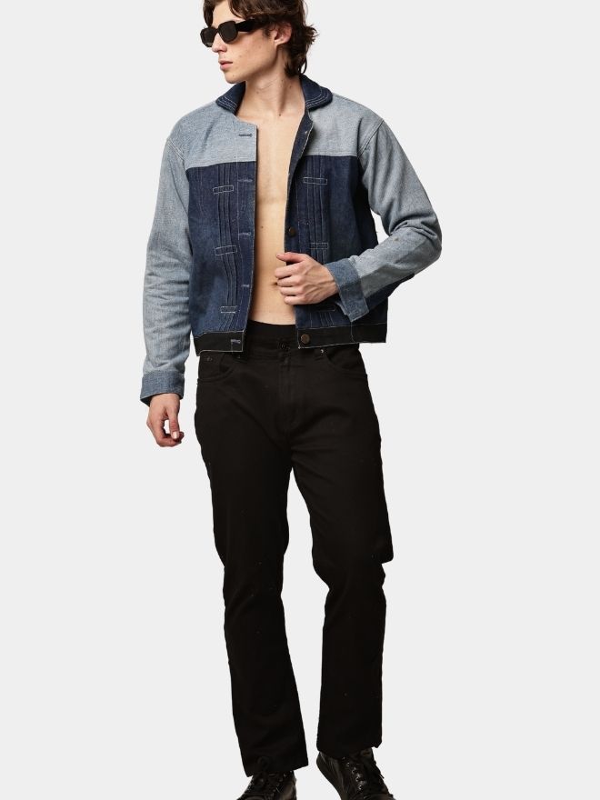 The silhouette is structured yet comfortable, making it ideal for layering. The minimalist design focuses on color contrast and panel alignment rather than heavy distressing, giving the piece a refined streetwear edge.