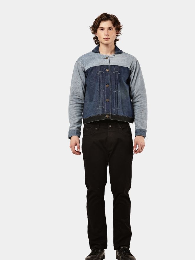 This reworked jacket is constructed from vintage duo-tone denim, carefully combining two contrasting washes — a light faded blue and a deep indigo tone — to create a balanced, modern panel layout.