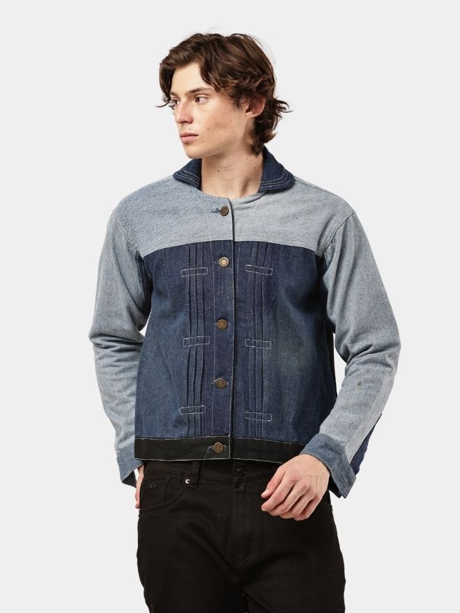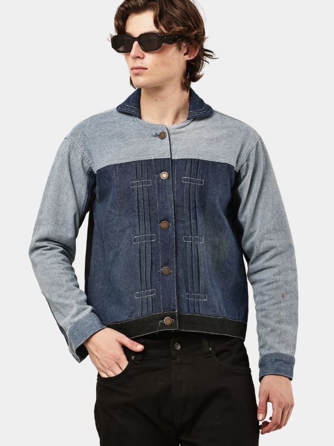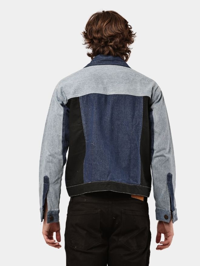 Custom reworked denim jacket crafted from vintage two-tone denim fabrics. Features contrasting light and dark wash panel construction with a clean structured silhouette. Available in sizes S to XL.