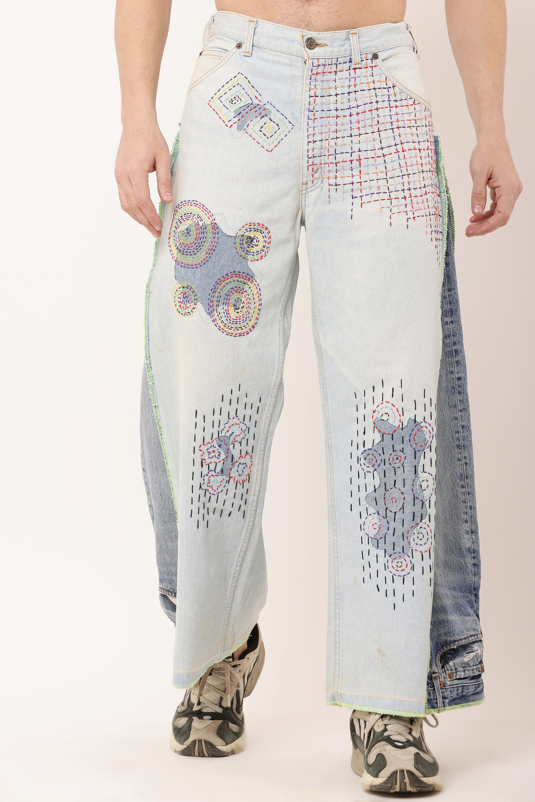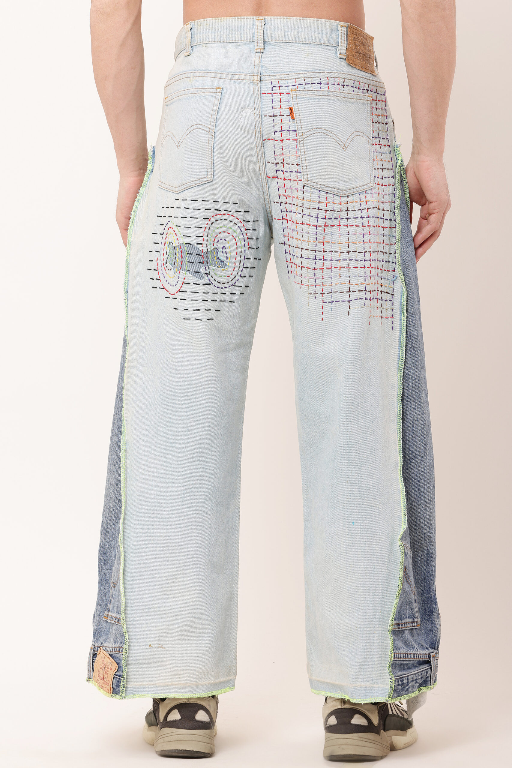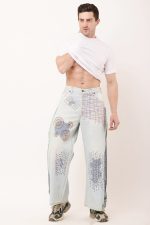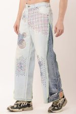 Sashiko reverse belt denim jean design combines a relaxed, baggy silhouette with the intricate beauty of hand-embroidered sashiko stitching. Inspired by a traditional Japanese technique originally used for fabric reinforcement, sashiko adds a unique, geometric flair to the denim. The design aligns with current global trends, emphasizing sustainability and environmental responsibility while preserving the art of handcraftsmanship. This piece not only offers comfort but also tells a story of cultural heritage and eco-conscious fashion.