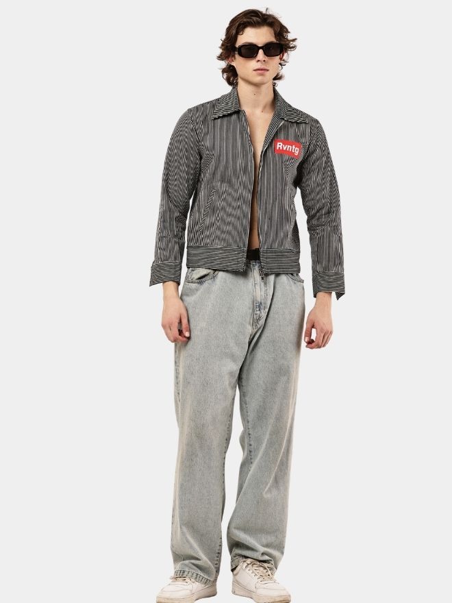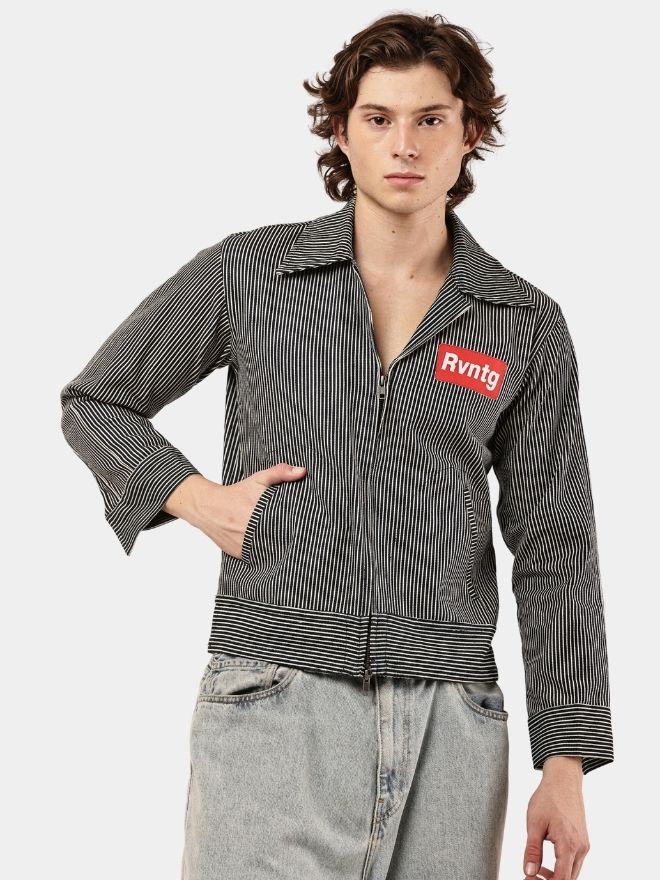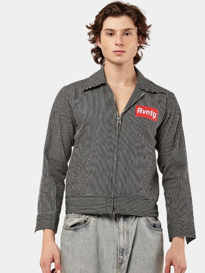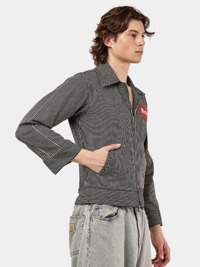 A bold striped denim jacket shirt featuring a cropped fit, workwear-inspired design, and statement chest patch detail.