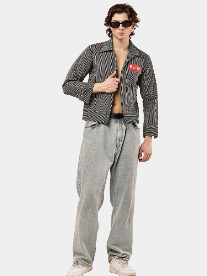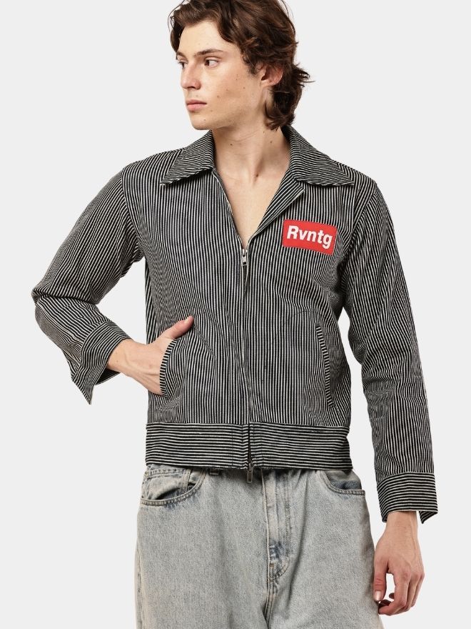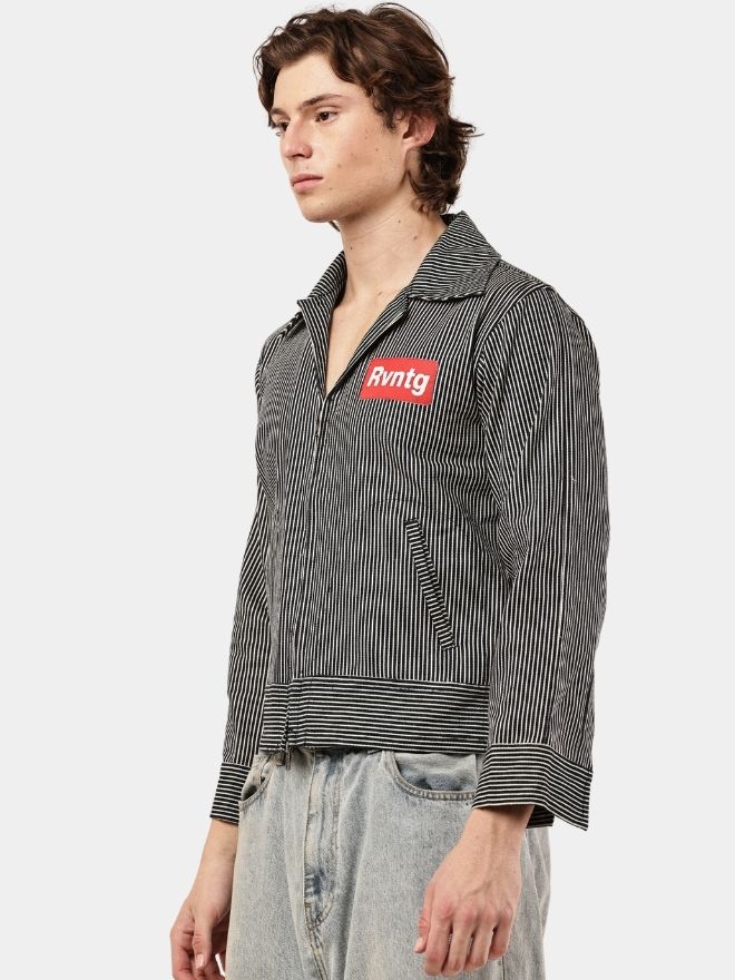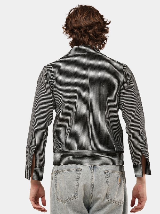 This piece is crafted from striped denim fabric, combining the durability of denim with a distinctive vertical stripe pattern that adds a sharp, modern edge. Designed in a jacket-style shirt silhouette, it merges elements of classic workwear with contemporary streetwear aesthetics.