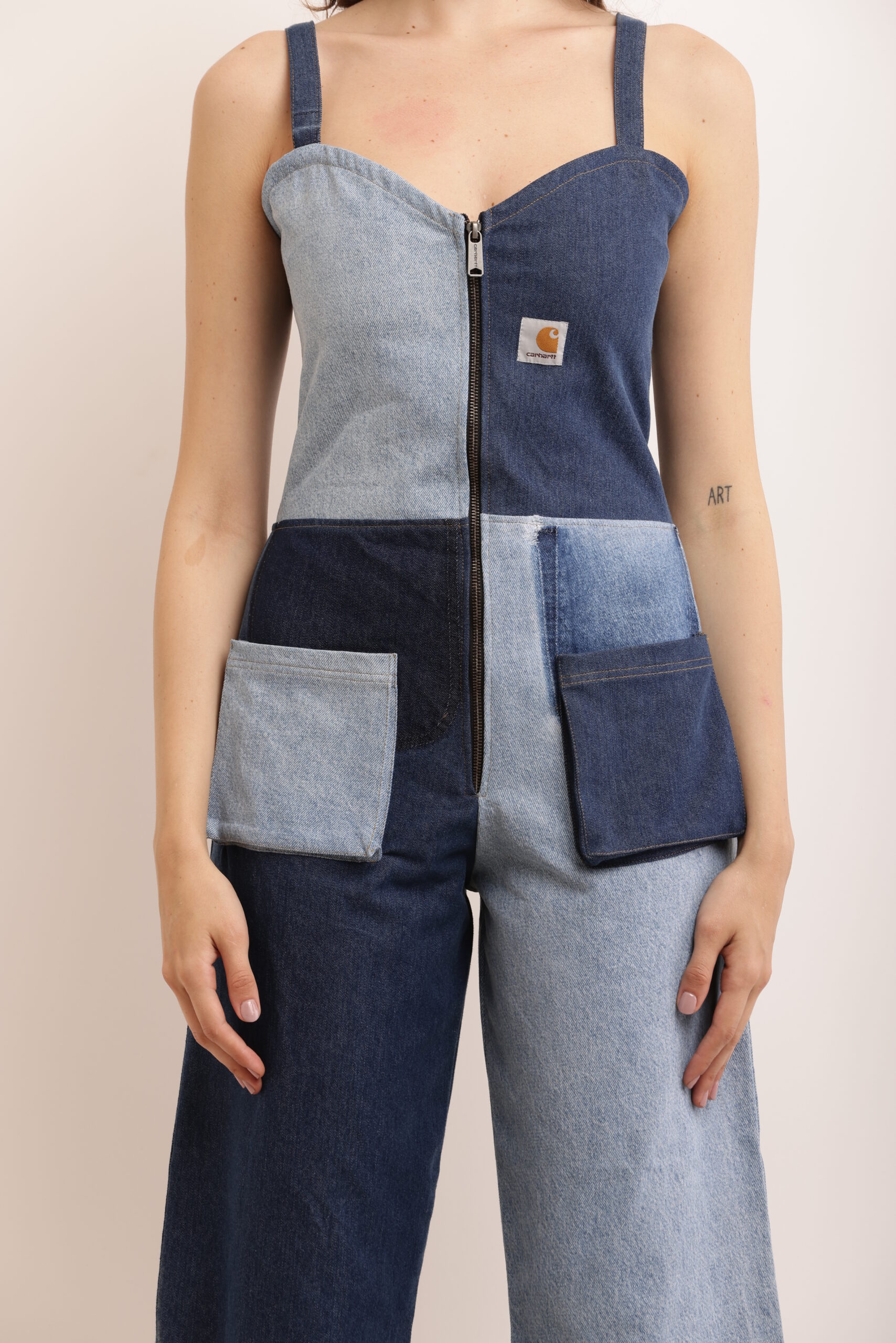 The Denim Jumpsuit captures the essence of timeless style, blending tonal blue long panel denim from vintage jeans brands like Carhartt. With its front closure zipper and two square-shaped patch pockets, it’s a harmonious fusion of fashion and function.