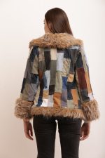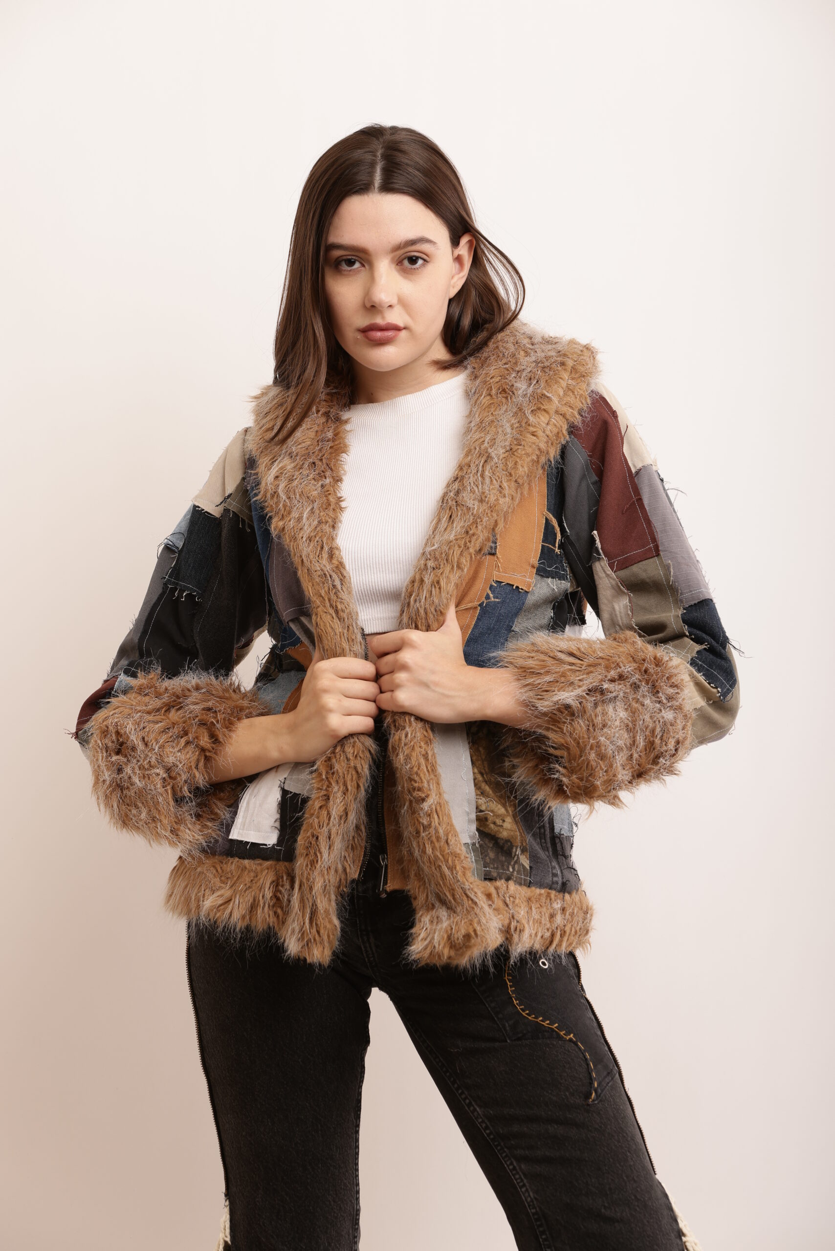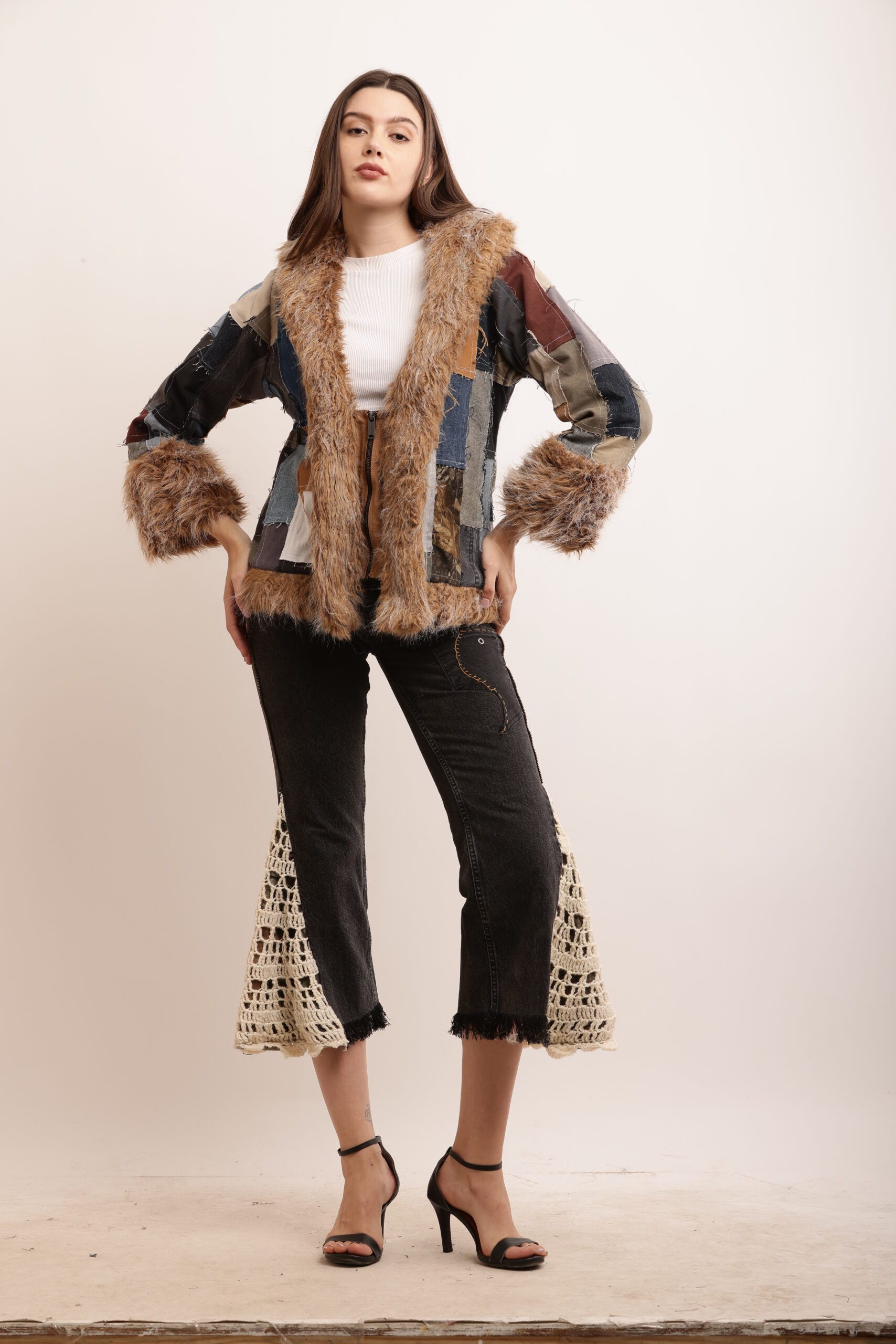 The Mix & Match Patch Jacket is a beautiful fusion of rectangular denim patches from vintage jeans brands like Levi’s, Dickies, and Carhartt, combined with the elegance of vintage Afghan faux fur on the collar and sleeves.