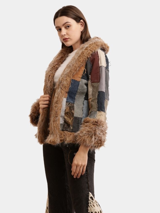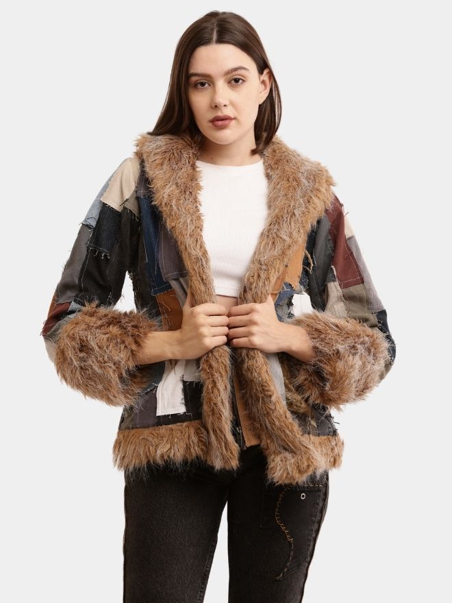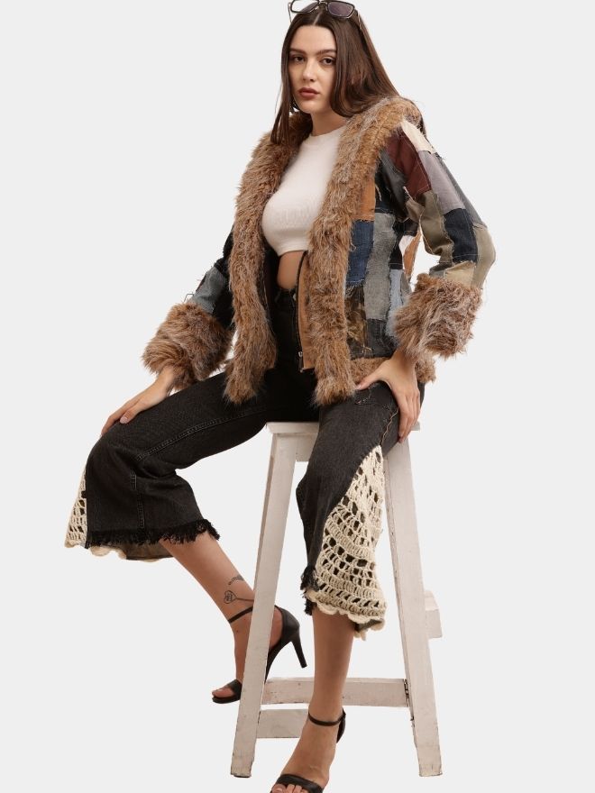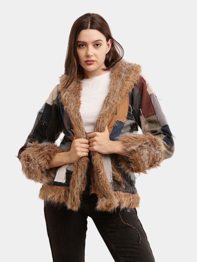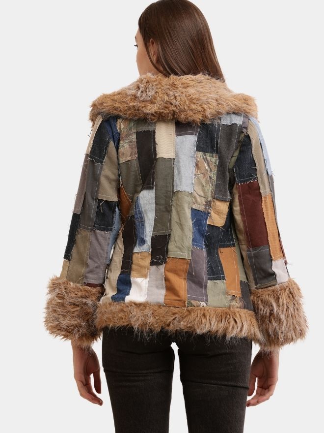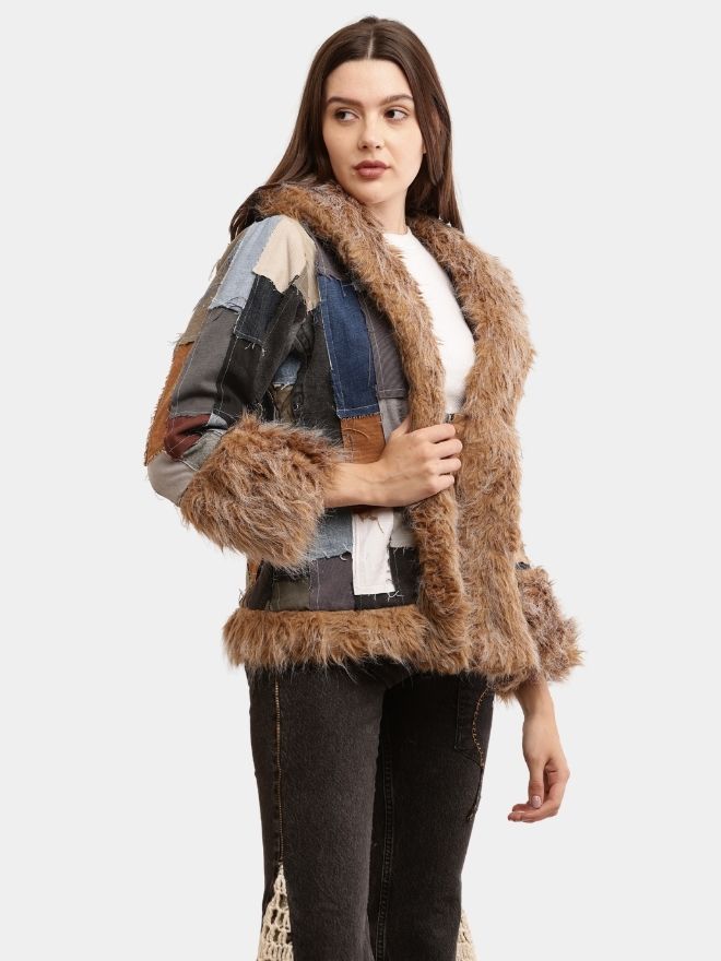 The design is elevated with vintage Afghan-inspired faux fur placed at the collar and sleeves, adding warmth, texture, and a luxurious contrast against the rugged denim patchwork. The interplay between structured denim and soft fur creates a bold yet refined aesthetic.
