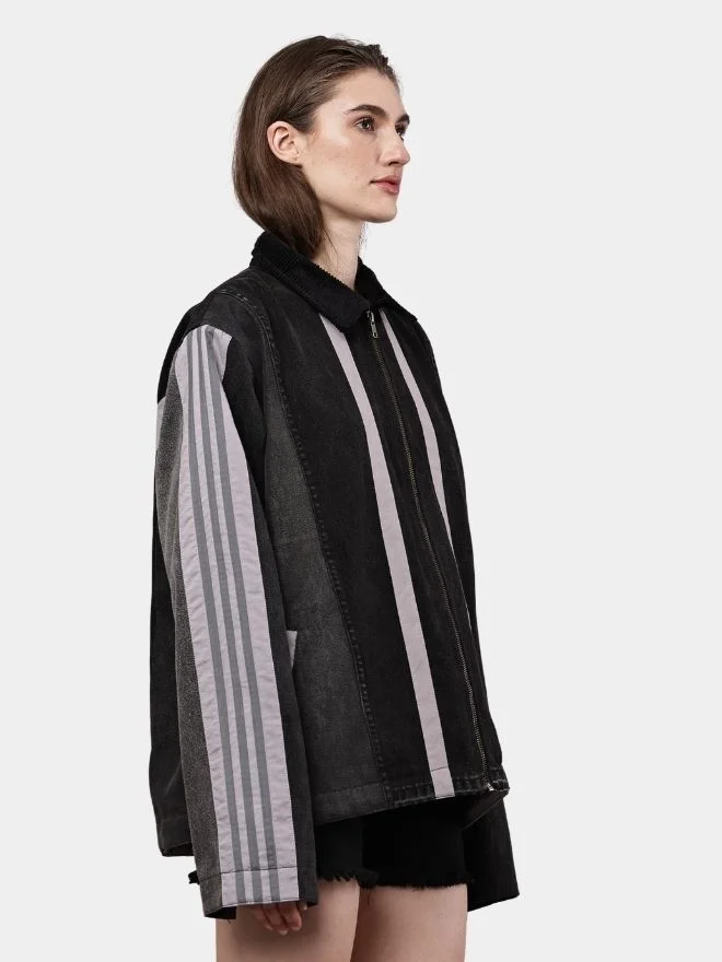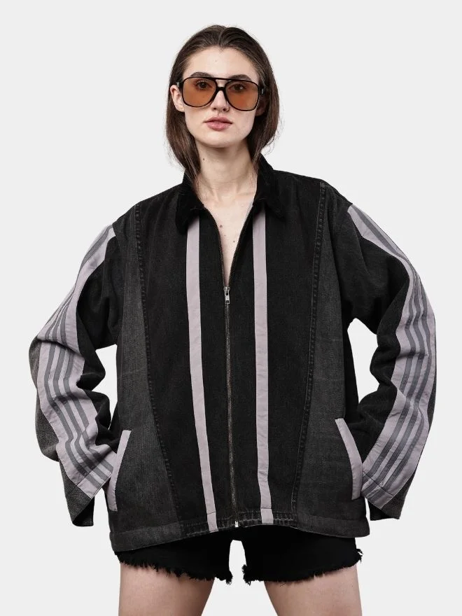 This unique jacket is crafted from a combination of light and dark black denim, creating a striking two-tone contrast that adds depth and visual texture to the design. The jacket is enhanced with light grey stripe panels running along the sleeves and extending across the front and back, giving the piece a dynamic and contemporary streetwear aesthetic.