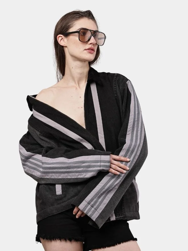 A modern two-tone denim jacket crafted from light and dark black denim, featuring bold grey stripe panels across the sleeves, front, and back. Finished with a front zipper closure for a sleek streetwear look.