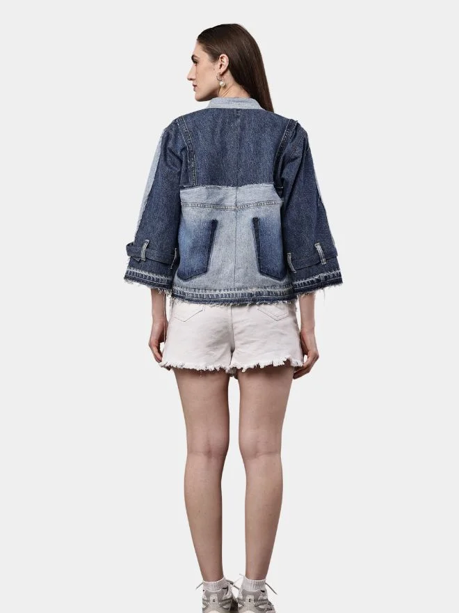 Two Tone Blue Reworked Denim Jacket with Utility Pockets