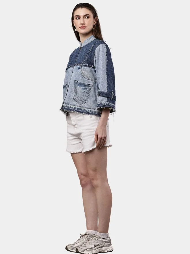 The sleeves are finished with hem cuffs, providing a neat and comfortable fit while enhancing the overall silhouette. At the back, the jacket showcases pocket shade detailing made from denim fabric, adding an interesting layered texture and a unique design element.