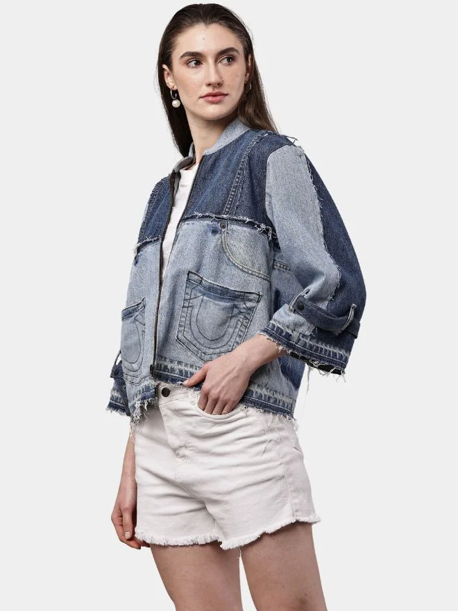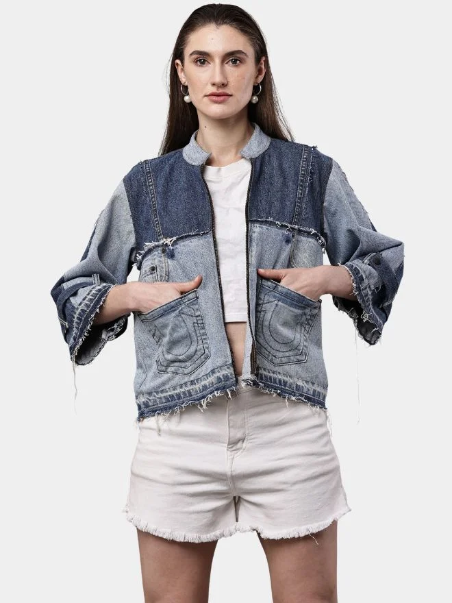 A unique reworked jacket crafted from two tone blue pants and denim fabric. Featuring front zipper closure, three utility pockets, hem cuff sleeves, and pocket shade detailing on the back for a bold, contemporary look.