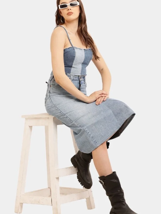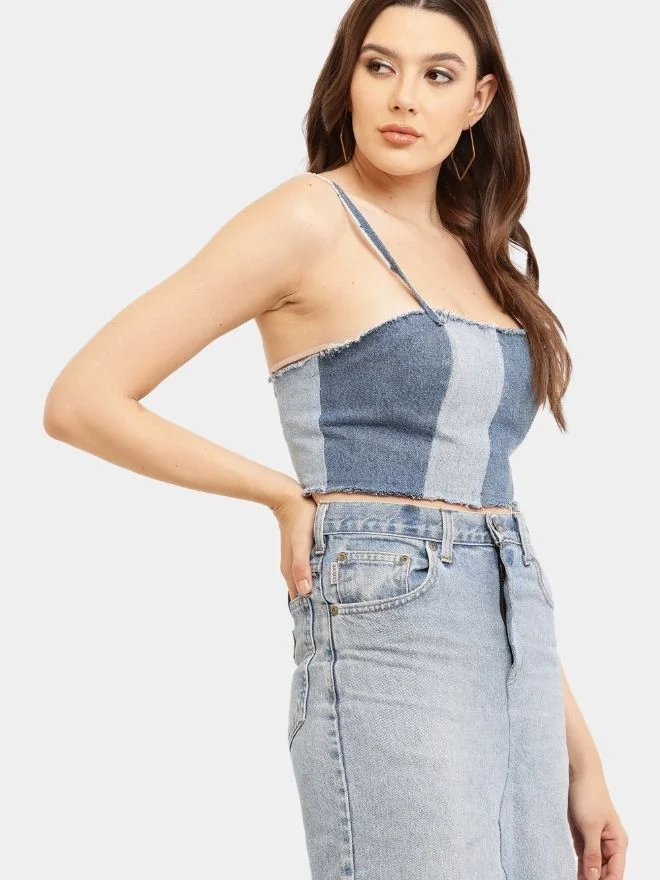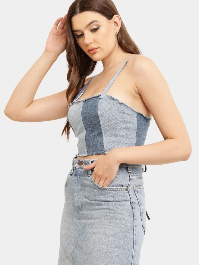 The Two-Tone Raw Denim Corset Crop Top is a bold expression of modern denim design, combining rugged textures with a flattering silhouette. Crafted from contrasting shades of blue denim, the top highlights a striking two-tone effect that adds depth and visual interest to the garment.