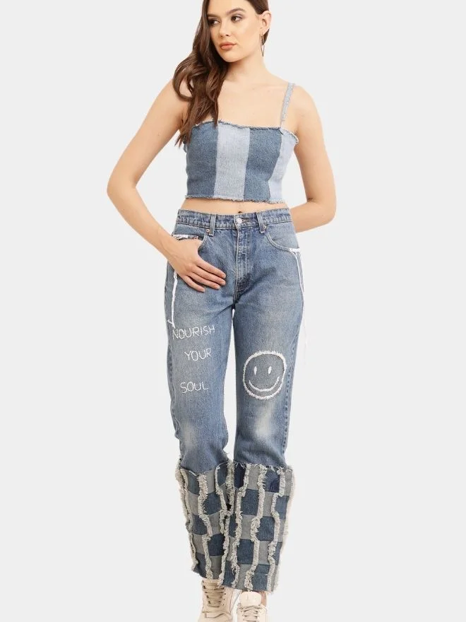 This garment is handcrafted using reworked denim, promoting sustainable fashion practices by giving new life to existing materials.