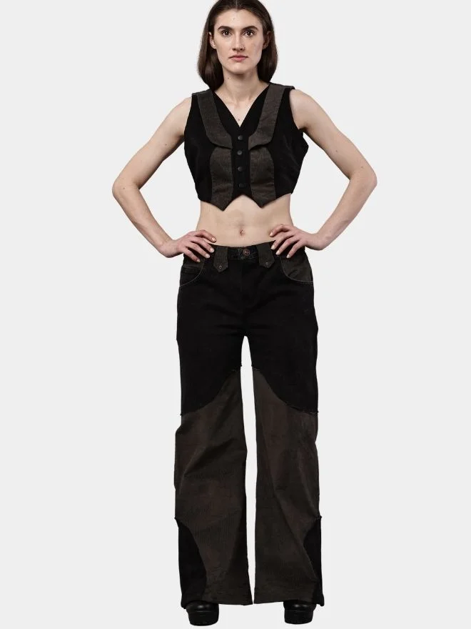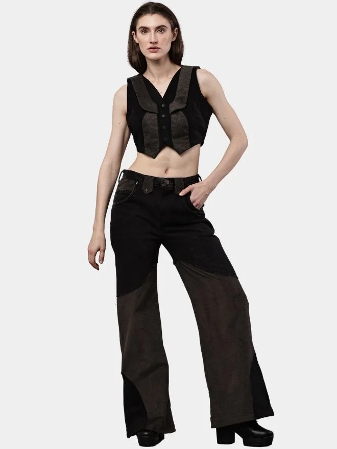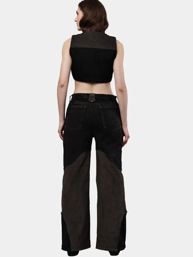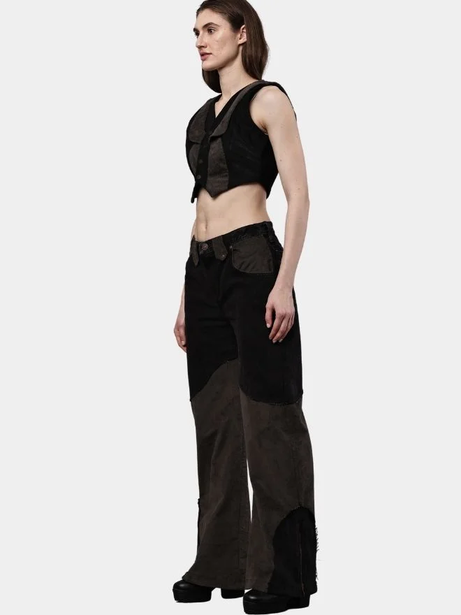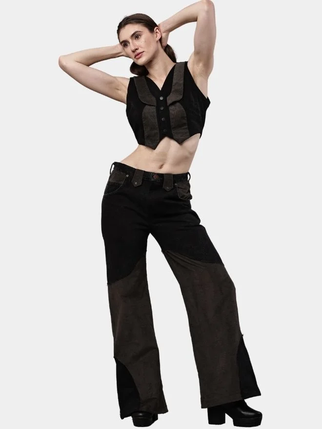 Two-Tone Reworked Denim Co-Ord Set – Patchwork Pants & Sleeveless Mini Jacket Top