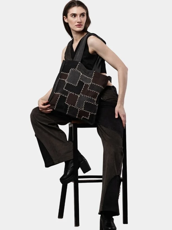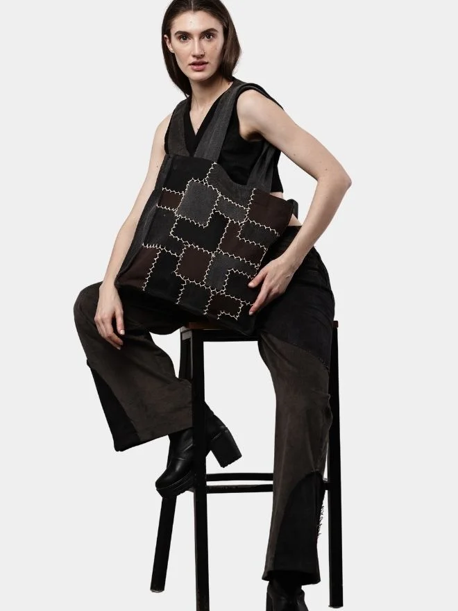 A bold reworked denim co-ord set crafted from repurposed denim pants, featuring two-tone patchwork pants and a uniquely shaped sleeveless mini-jacket top. Designed with brownish denim patch detailing and raw vintage character, this set blends sustainable craftsmanship with standout streetwear style.