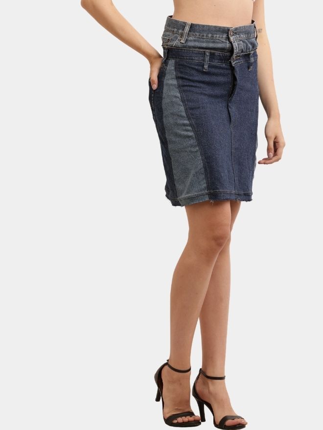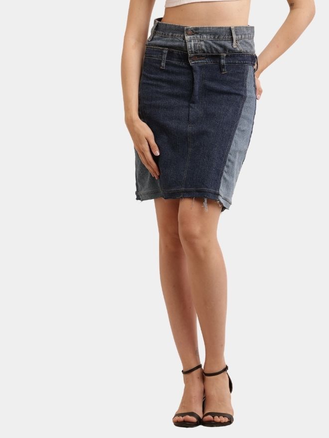 The skirt features contrast denim washes, giving it a distinctive patchwork look that stands out effortlessly. The reconstructed waistband detail, panel stitching, and subtle distressed hem add a unique handcrafted touch. Because it is made from upcycled materials, every skirt carries slight variations, making each piece one-of-a-kind.