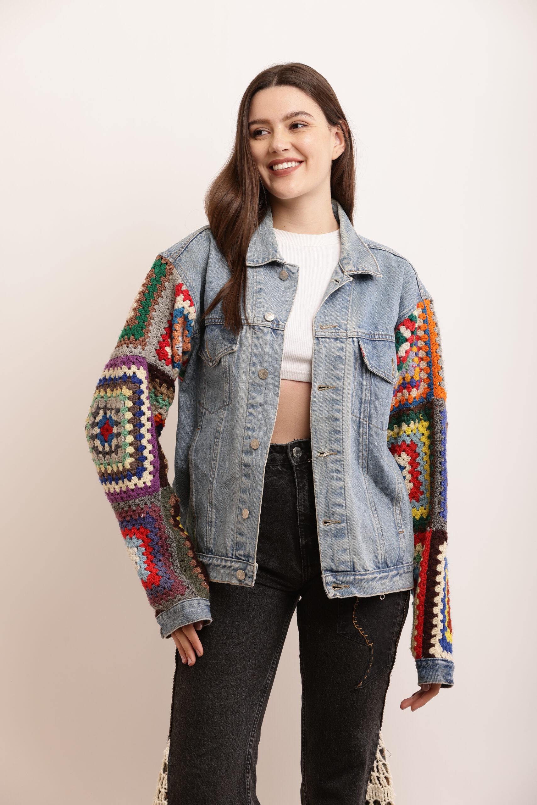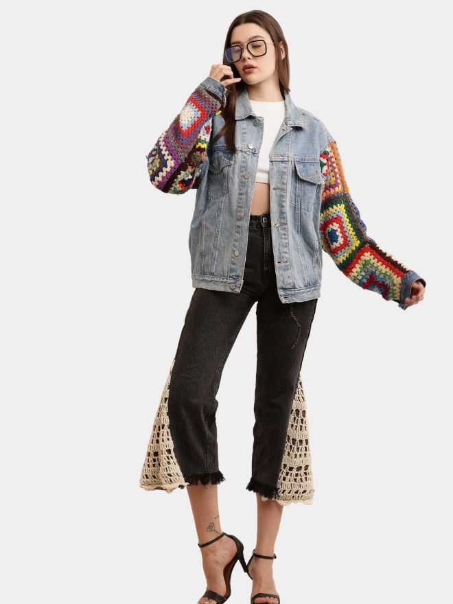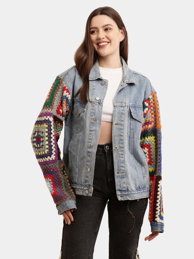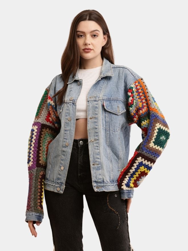 Designed with vibrant multicoloured crochet on the sleeves and inside of the jacket, this Unisex Crochet Denim Jacket is a true work of art.