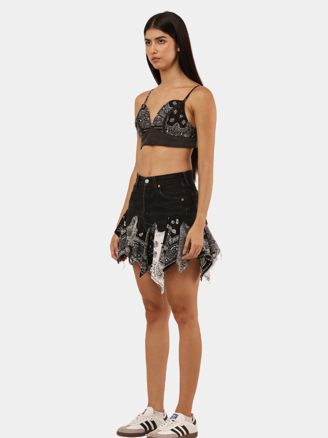 Reconstructed mini skirt crafted from vintage pants, featuring layered panel detailing and raw fringe hem. A bold rework piece with movement and edge.