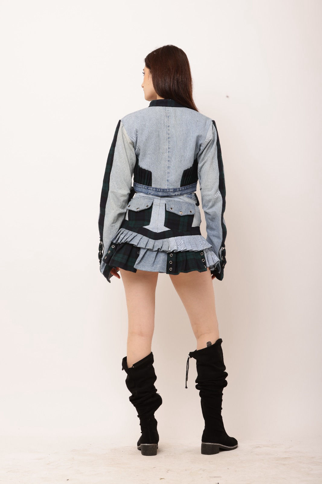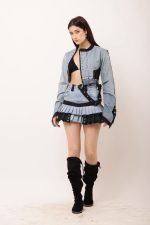 Combining old denim jeans and shanto a fresh, edgy design. The dropped jackertures a zipped front with accentuated panels anddary detailing on the sleeves. The mini skirt uses off denim pleats and shirt pleats, a doubl-belt detail enhanced the waistband. Perfect for making a sustainable fashion statement, this set beautifully blends street style with a touch of vintage character.