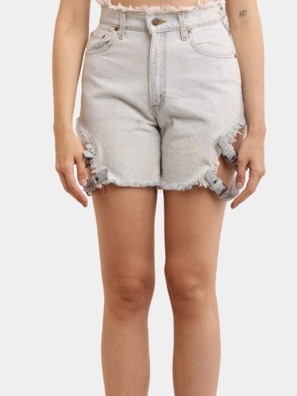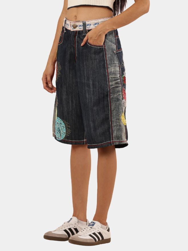 These standout jorts are crafted from authentic Japanese pants, reworked into a bold, fashion-forward silhouette. Designed with a relaxed knee-length fit, the piece highlights detailed machine embroidery artwork placed along the front and side panels.