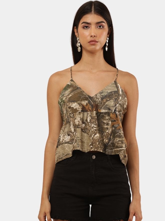 A stylish cropped cami top crafted from vintage Realtree camouflage pants, featuring thin straps, a flared silhouette, and a lightweight, breathable feel.