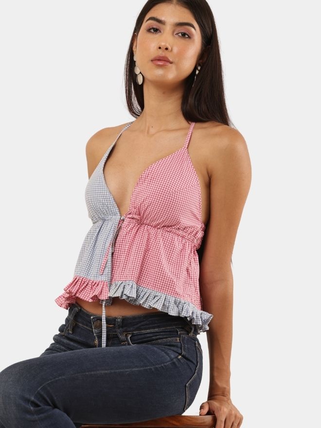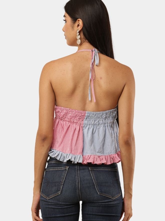 Unique upcycled two-tone halter neck top made from mixed fabric panels in pink and grey patterns. Features a ruched front with ruffle hem for a feminine look. Lightweight, breathable, and handmade. Cropped fit. Please check photos for details.