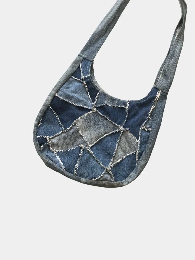 This bag is crafted from vintage denim jeans, carefully reworked into a unique patchwork shoulder bag. Various patches of blue and grey denim fabrics are combined to create a layered, textured surface that highlights the character of reclaimed materials.