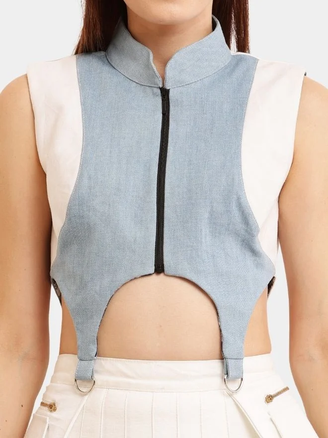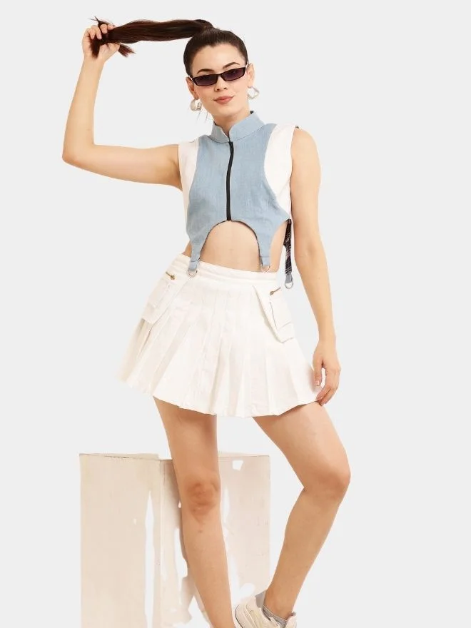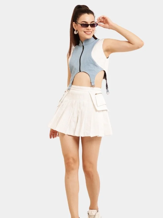 A stylish co-ord set crafted from soft upcycled fabrics, featuring a structured white and blue zip-front top with a standing collar and a playful pleated skirt with functional pocket flaps. A perfect blend of classy tones and modern streetwear design.