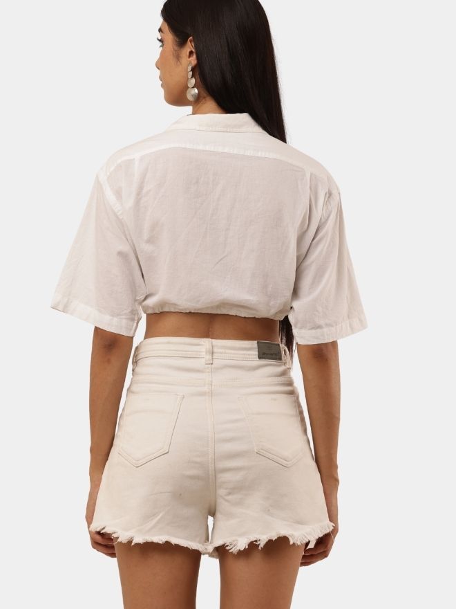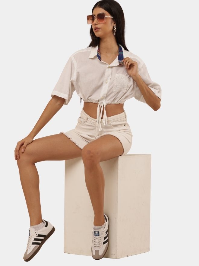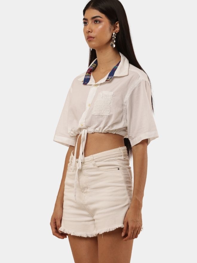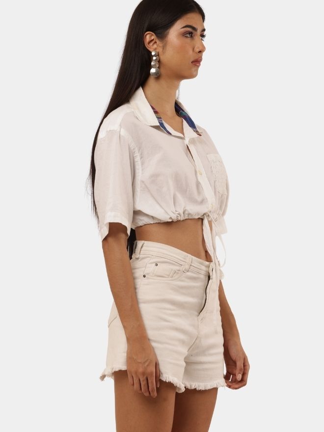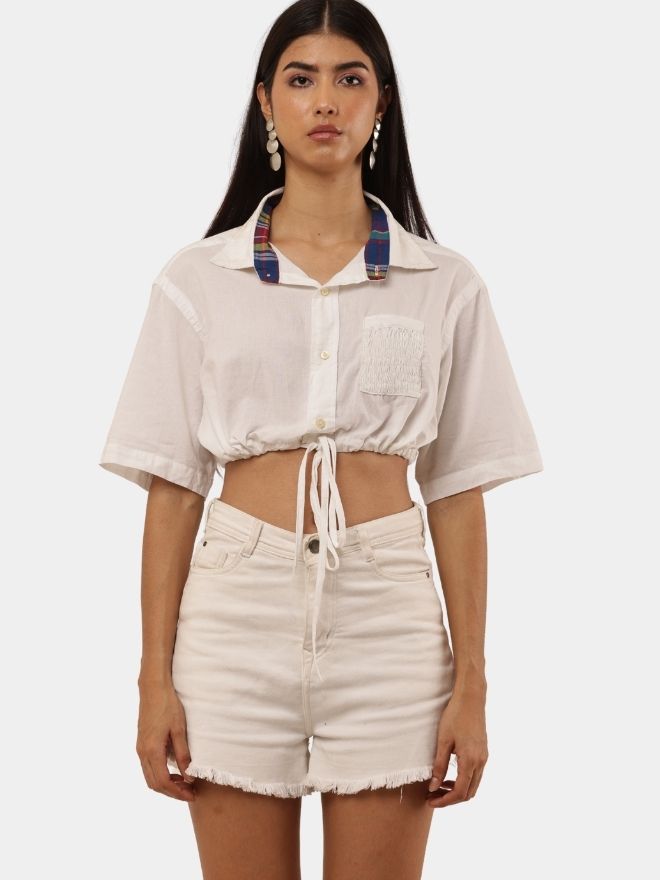 A trendy cropped top made from a vintage white shirt, featuring a contrast inner collar detail, adjustable drawstring waist, and relaxed half sleeves.