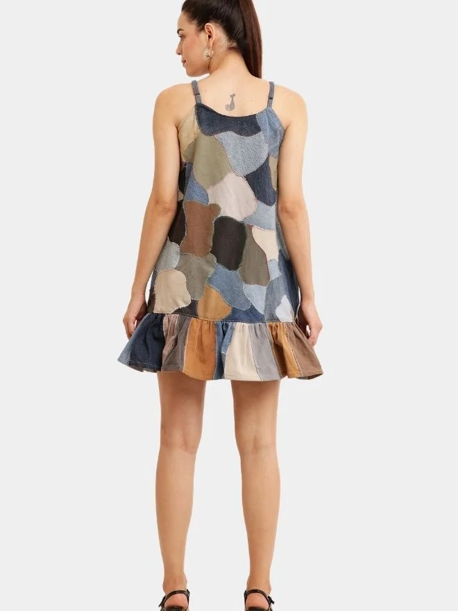 A beautifully crafted vintage-inspired dress featuring abstract patchwork made from repurposed pants, finished with colourful zig-zag stitching, a U-shaped neckline, and a voluminous silhouette.