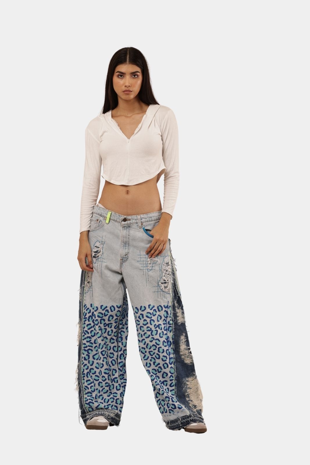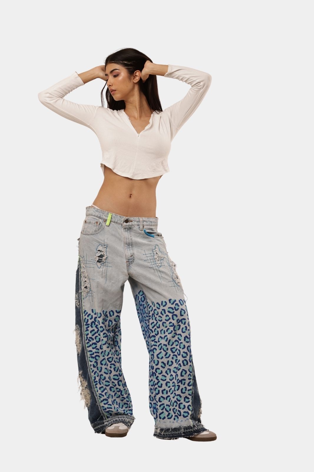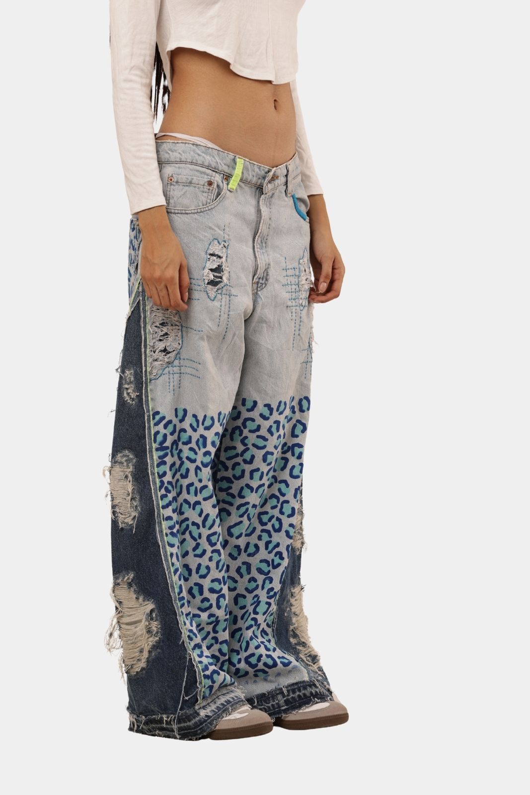 One-of-a-kind vintage denim pants reworked with bold leopard-print panels. Handmade, edgy, and designed for standout street style.