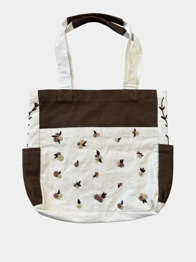 A handcrafted bag made from white and brown vintage denim, featuring intricate spider-touch hand embroidery that blends vintage charm with modern artistic aesthetics.